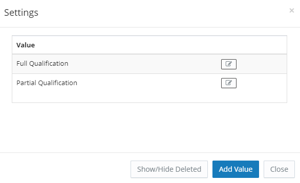 The final area of configuration for Qualifications is Qualifications. Here you can view and edit any already added Qualifications, as well as add any new.