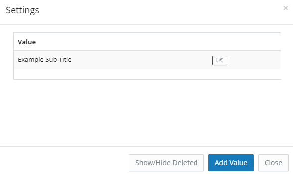 Selecting the ‘Add Value’ button will allow for you to create a new Sub Title.