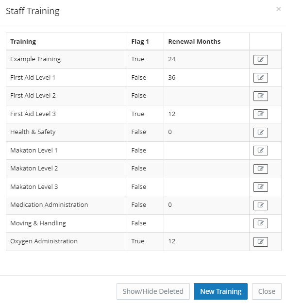 Selecting the ‘Show/Hide Deleted’ button will allow for you to toggle view any deleted Training.