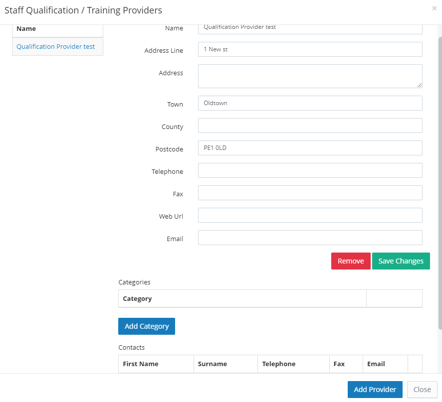 The second configurable area is Qualification / Training Providers. Selecting this will generate a window where you can view any already added Providers (Company or Organisation providing the Qualification) and add any new.