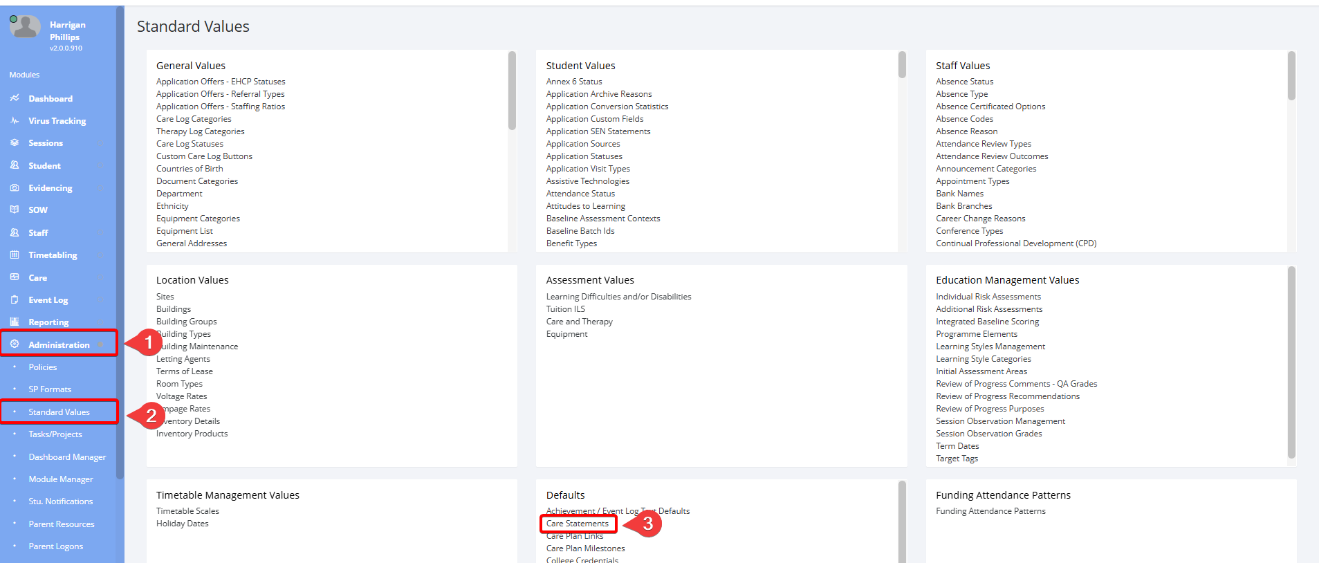 1. To create a Care Plan on Databridge, navigate to Administration > Standard Values > Defaults > Care Statements.