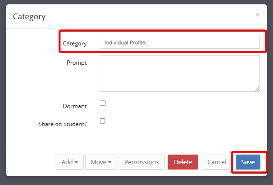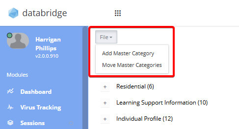 4. Clicking Add Master Category will open a new window for you to populate. Within this window you can add the label for the new Category you are making in the Category field, then clicking Save. In this example I am going to be adding a new Individual Profile category.