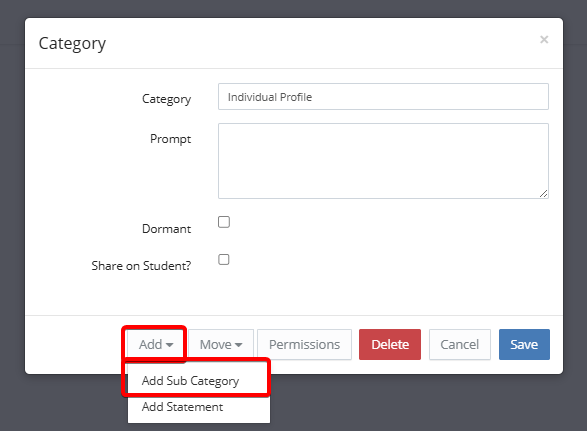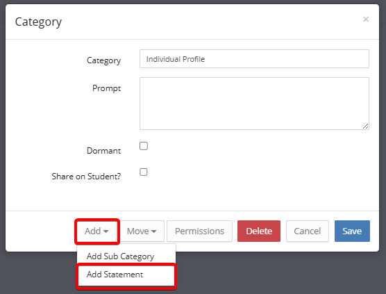 8. Once you are happy with your Sub Categories, you can now click one of them which will generate a window as before. Clicking Add will allow you the option of adding further sub categories, or in this example, we are now going to click Add Statement.