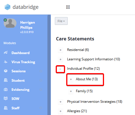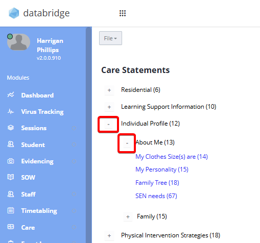 9. Clicking Save will take you back to the Care Statements page. Now when you click the + symbol by your sub category, it will now load your statements below.