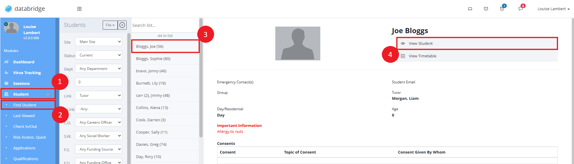 1. To view an Event Log on Databridge, you have two options. Firstly, if you wish to view an individual’s Event Logs, it can be done on their profile. To do so, navigate to Student > Find Student > Select the Student from the list > View Student.