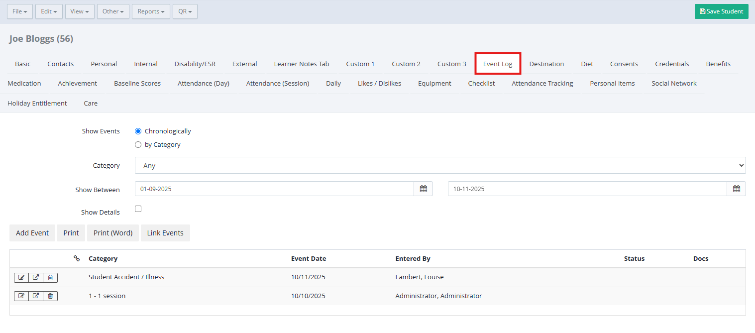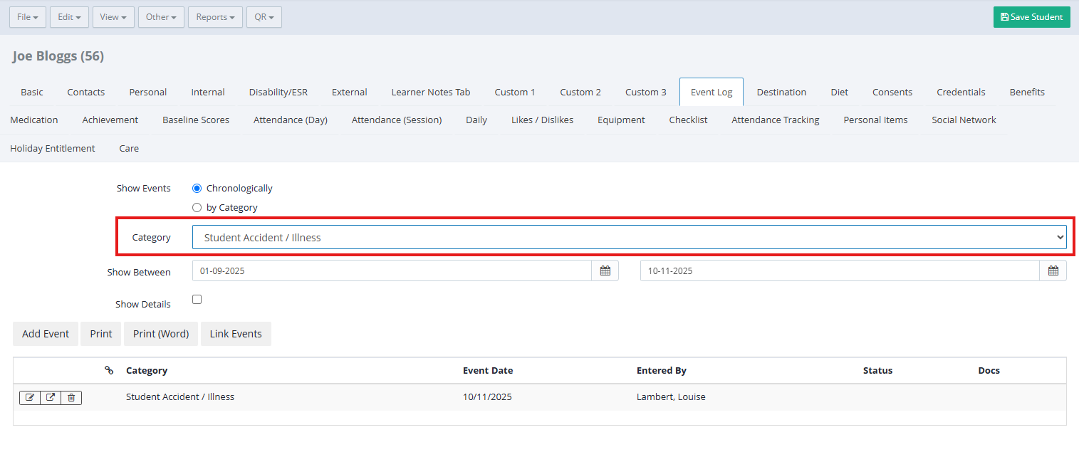 3. The Event Log Tab will show you all Event Logs attached to this student. At the top of the page, you have multiple filter options to narrow the list, such as Category, which will load all Events logged for this student under said category.