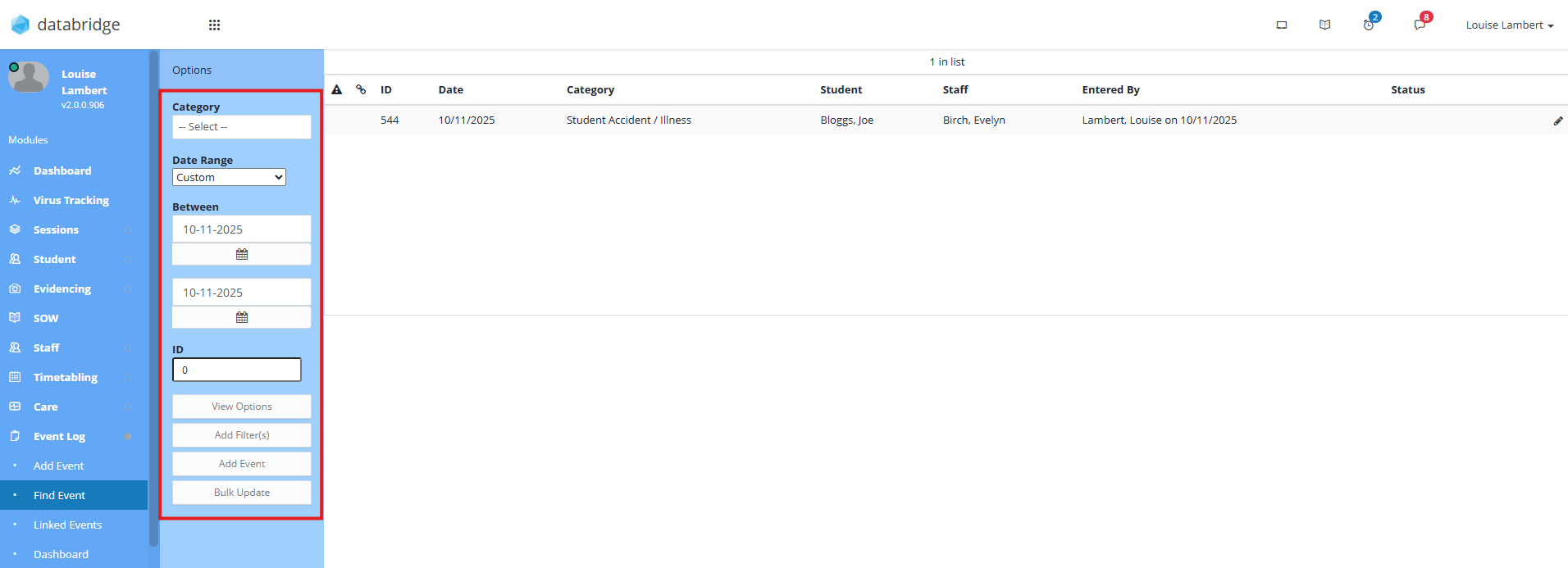 4.1. Clicking Find Event will load a window with a set of filters on the left-hand side. Here you can select the Category, set a Date Range, type in the Event Log ID if you know it, as well as further Options below.