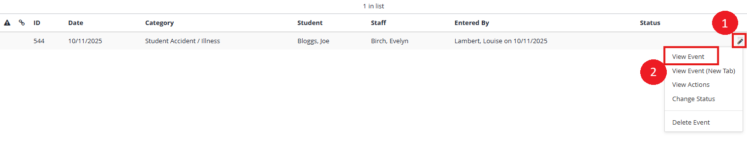 5. Using the Pencil icon by an Event will open a list of options for the individual event, including View Event.