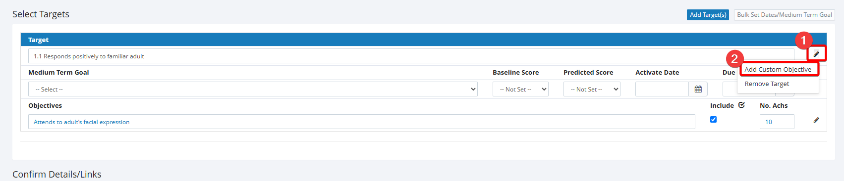 7.1. When adding Targets, you also have the option to add a Custom Target. To do so, simply click the Add Custom Target button once a curriculum area, skill area, and skill have been selected.