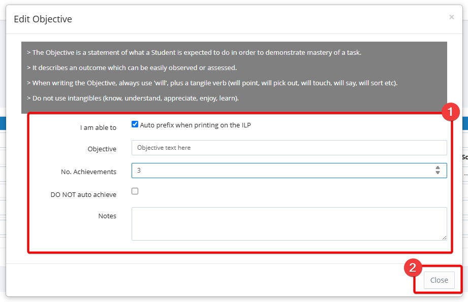 12. Fill in the information about the Objective within the fields that appear, then click Close: