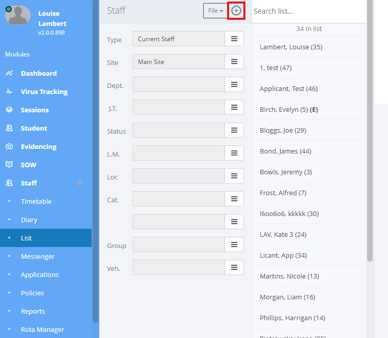 2. To add a new Staff member, click the + symbol at the top of the page.