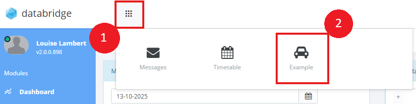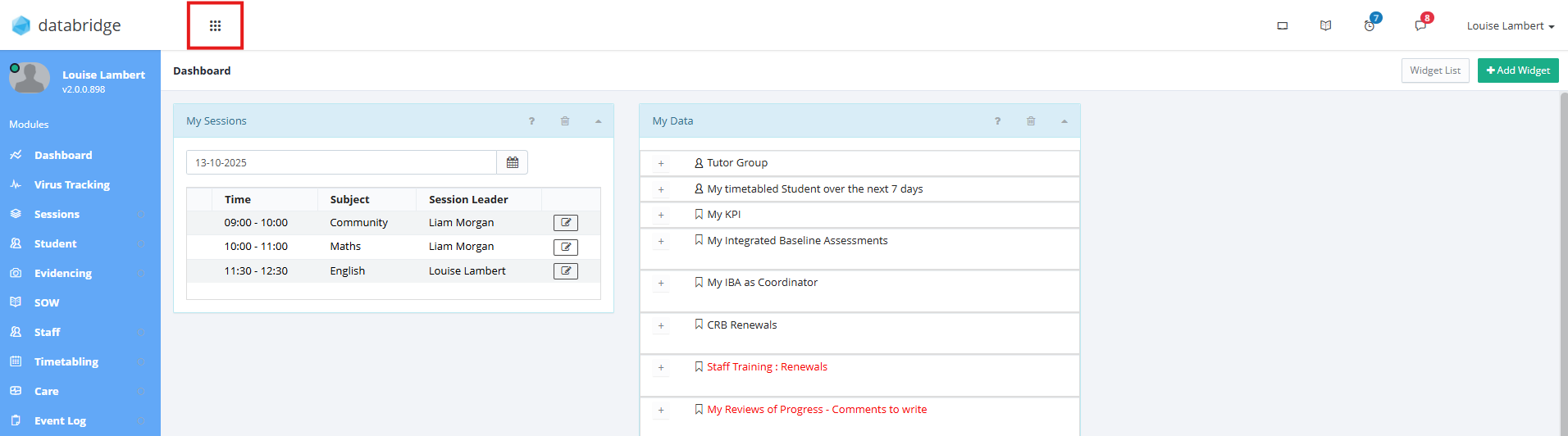 1. When on your Databridge Dashboard, at the top of the page is the Shortcuts menu (9 dots). Clicking the Shortcuts menu will load any already set shortcuts.