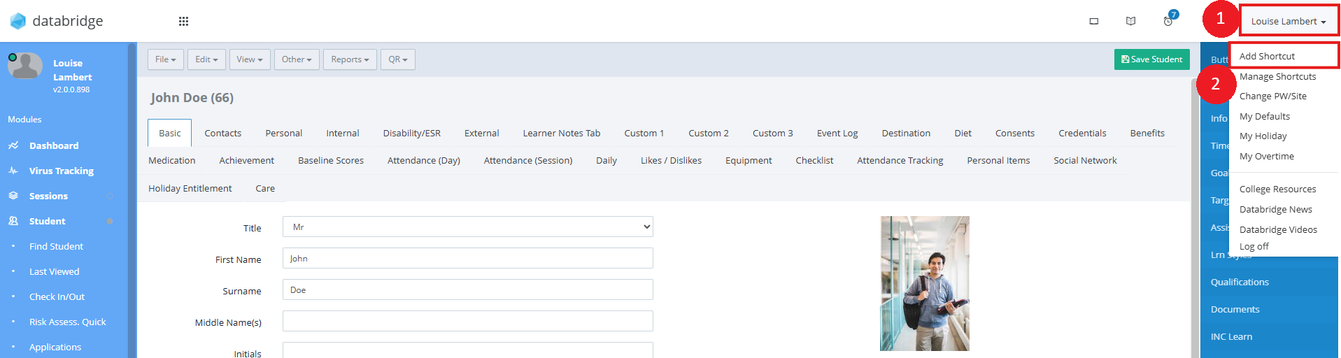 2. To add a new shortcut, navigate to the page you would like to add to this menu. In this example I will set one up for a students Profile. When on the page you would like to set a shortcut for, click your Name in the top right > Add Shortcut.