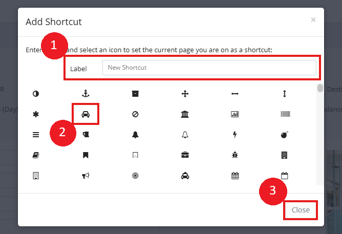 2.1. Clicking Add Shortcut will load a window where you can choose the Label for this shortcut and select an icon to represent it. Once you have set both, you can click Close.