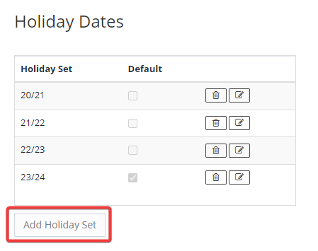 2. Clicking Holiday Dates will load the Holiday Dates page. Here you will find any Default/already set Holiday Dates. To add a new set of Holiday Dates, click Add Holiday Set.