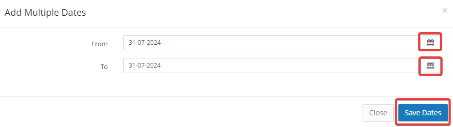 3.2 Clicking Add Dates or Add Dates in Range will load a very similar window. Using the calendar button, you can select the start and end date (or singular date if you have selected Add Date) before clicking Save Dates.