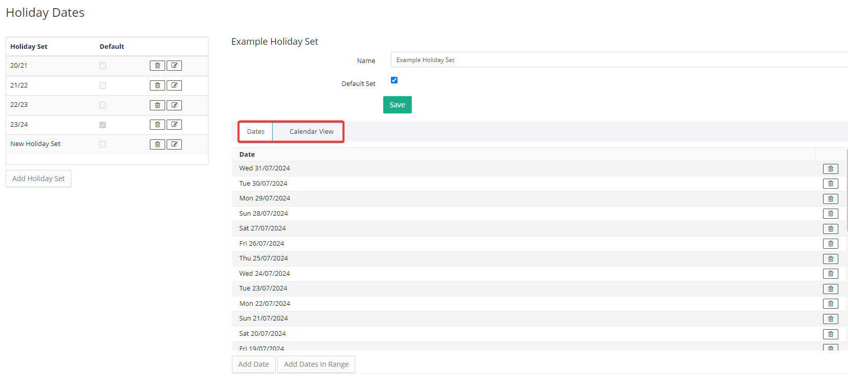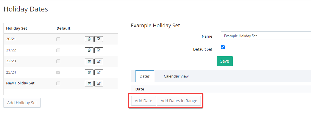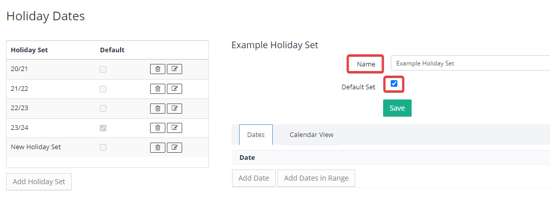 4. Once you have added all the dates required for this Holiday Set. Ensure you click the green Save button to save the new Holiday Set.