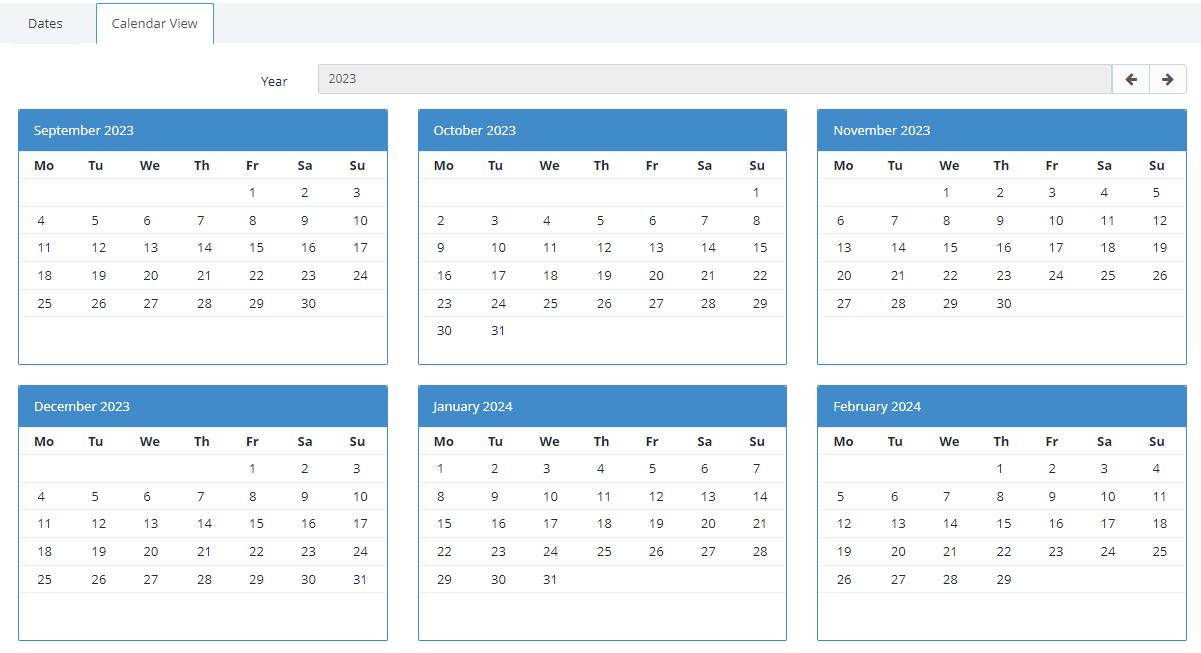 3.4. Clicking the Calendar View will change the display to show the same dates but in a calendar view.