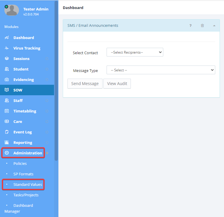 1. Before you start building your Timetables on Databridge, or recording Attendance, we advise that you first setup your Holiday Dates within Databridge. To do so, navigate to Administration > Standard Values.