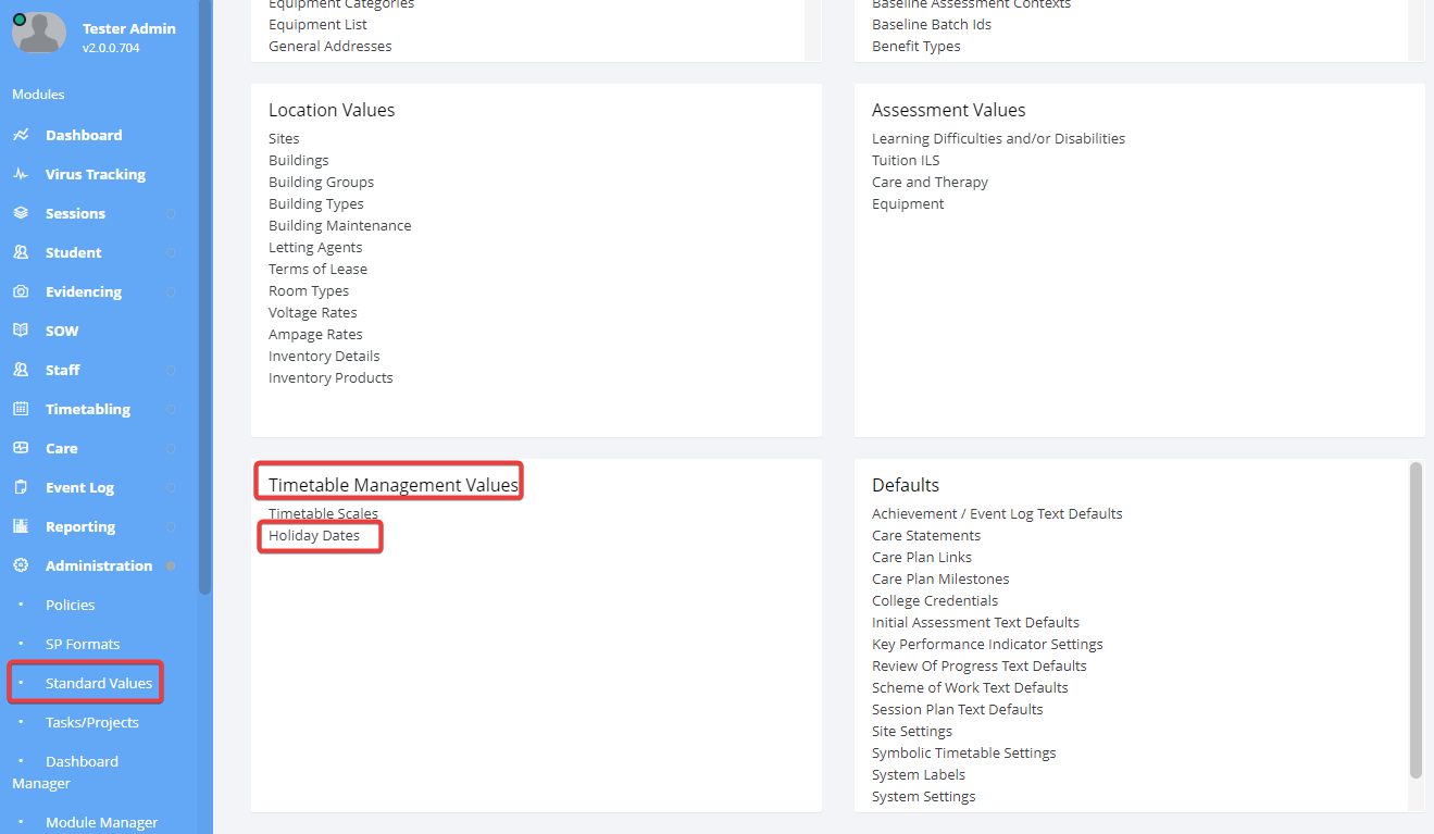 1.1. After clicking Standard Values, navigate to Timetable Management Values > Holiday Dates.