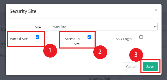 9. Clicking the Add Site button will open a similar window to before, where you can use the Site dropdown to select the Site you wish the Staff to be present at, then ensure you check the Part of Site and Access to Site boxes, before clicking Save.