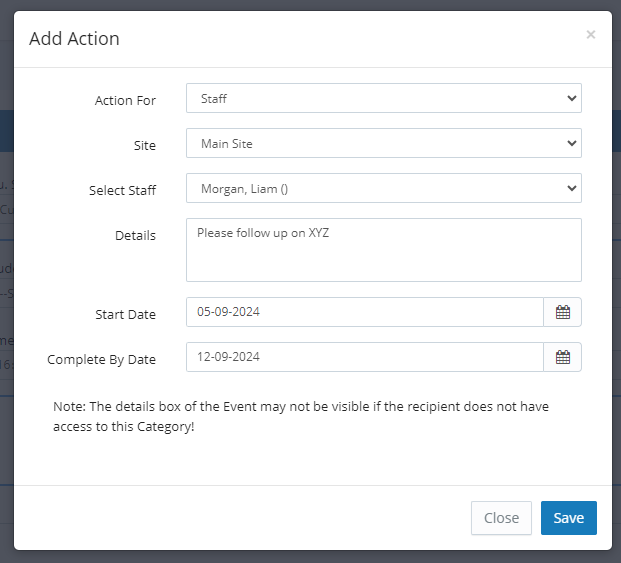 Fill in the details of the action in the Details box, select a Start Date and Completed By Date indicating when the action needs to take place. When these fields are all completed, press Save.