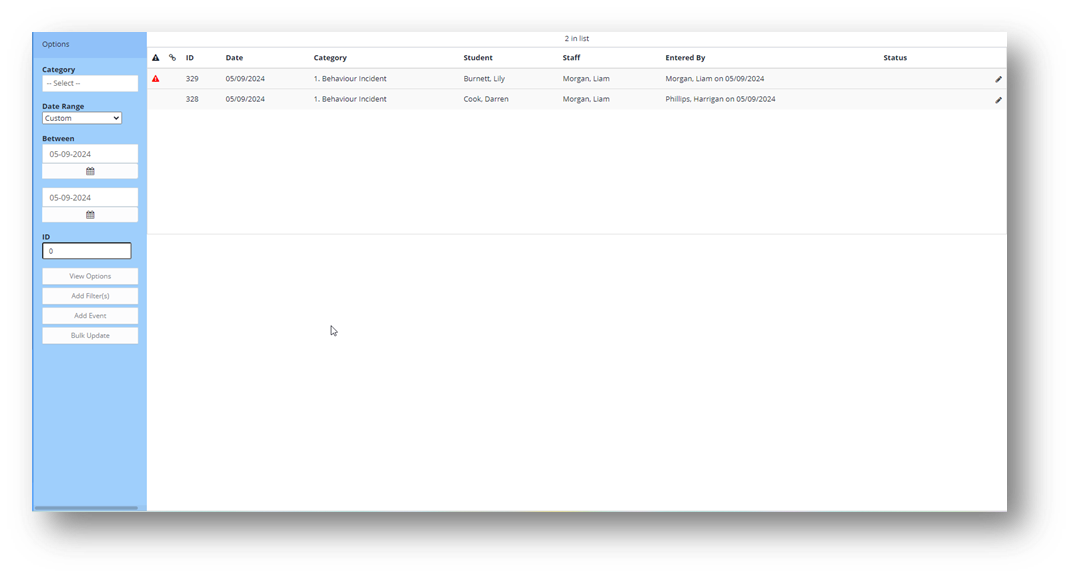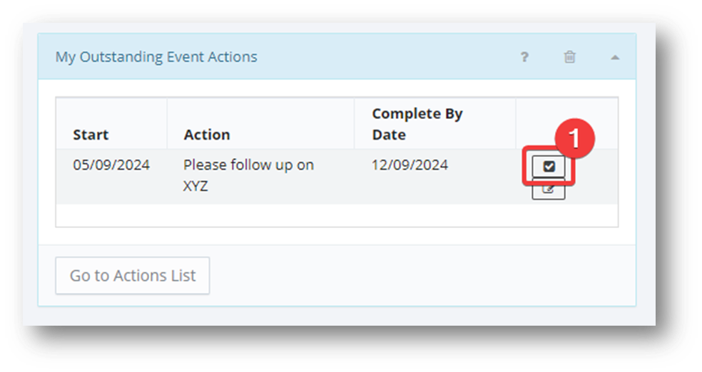 8. From this list of outstanding actions, simply find the one you want to action and select the Tick box Icon. From this screen, you can also select the Pencil Icon to go to the event log details, or go the the full list of actions.