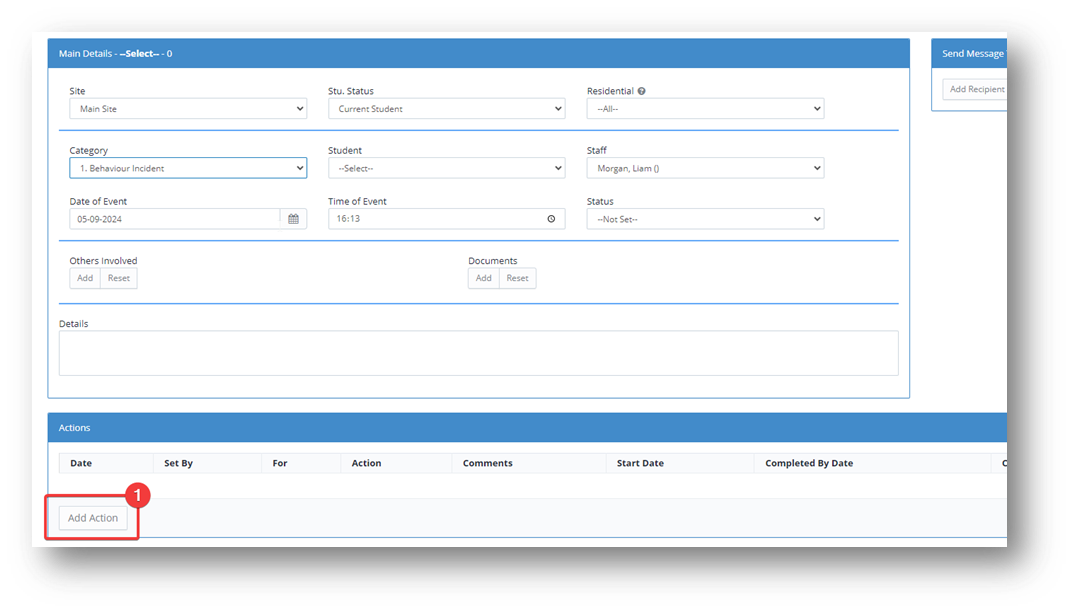 1. If the event log you are filling out allows for Actions to be created, you will find a section for this at the top of the event log, as seen in the screenshot below.