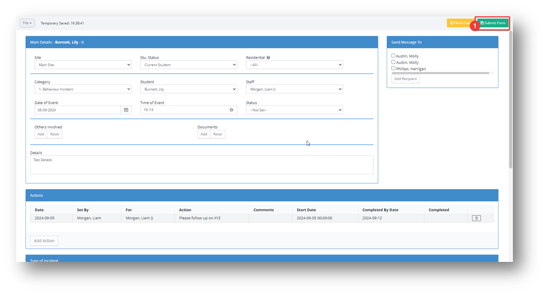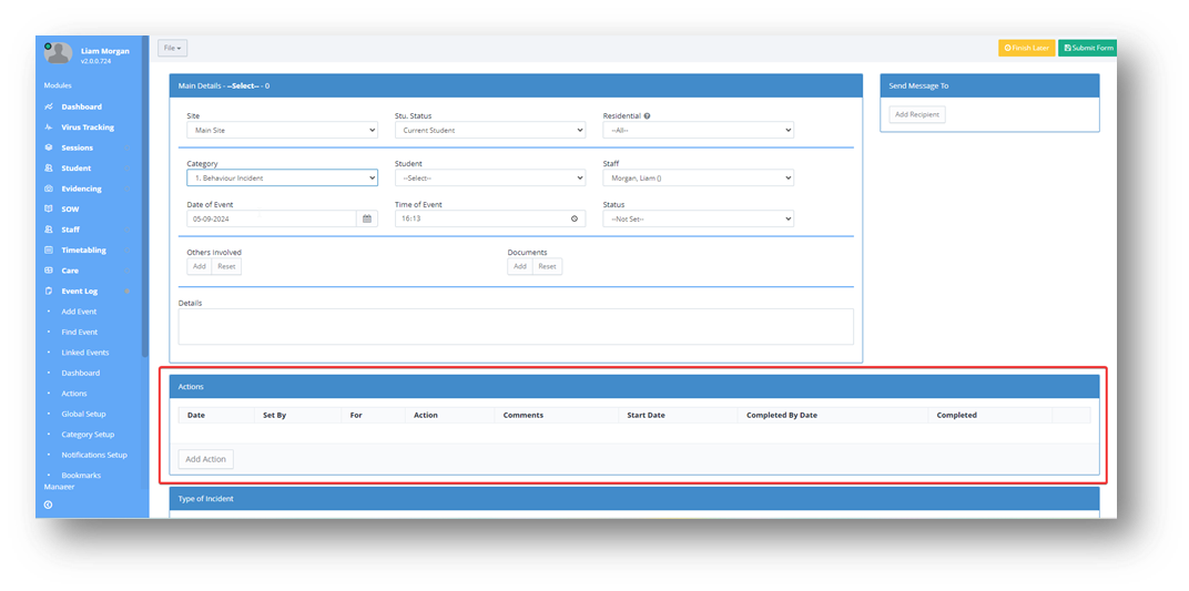 4. This will now appear within the Actions box. in order to submit the action, complete the rest of the event log as usual, and select Submit Form.