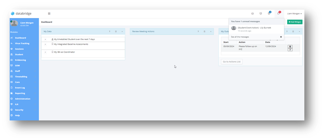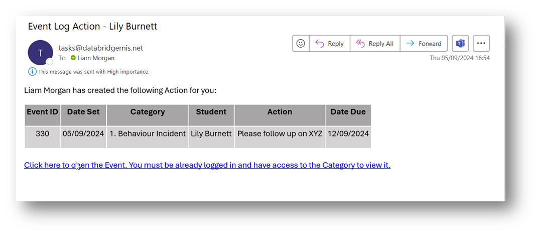 6. The member of staff assigned to the action will be notified in multiple ways. They will receive an email containing the details and a link to complete the action, and they will also get a notification via the Databridge messages system.
