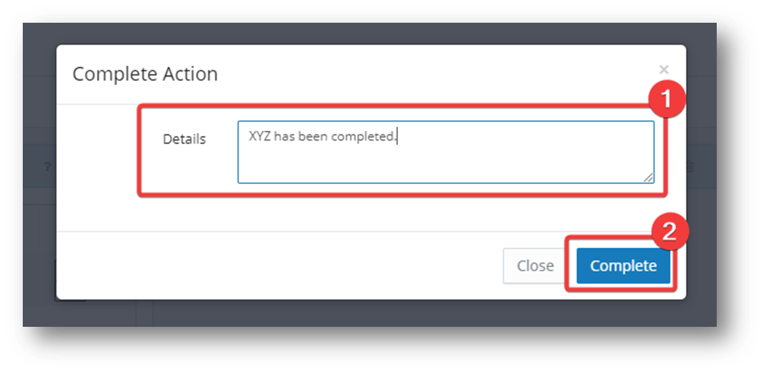 9. Type the details of what action you have taken in the Details box, then press Complete. The action has now been completed, and the member of staff that created the action, will receive a notification and an email, similarly to those in step 7.
