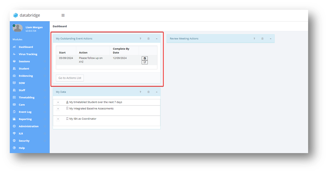 7. Users can also use the Widget, Event Log - My Outstanding Event Actions to continually track any outstanding actions. This will allow staff to see any outstanding actions on their dashboard when first logging in.