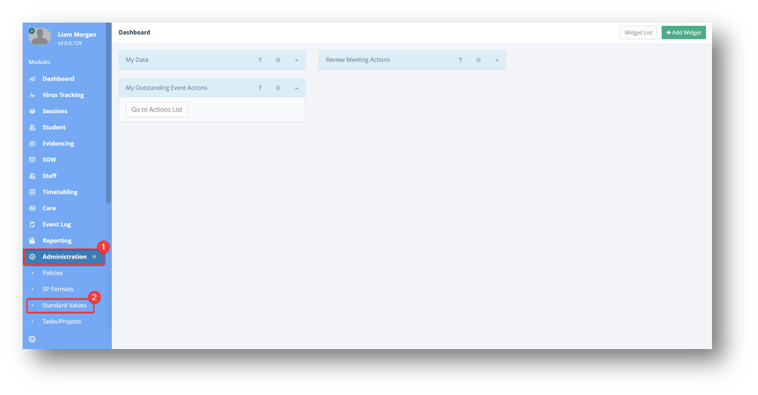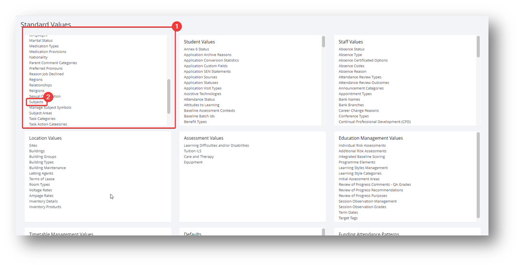 1. In order to set up / amend existing subjects, click on Administration > Standard Values
