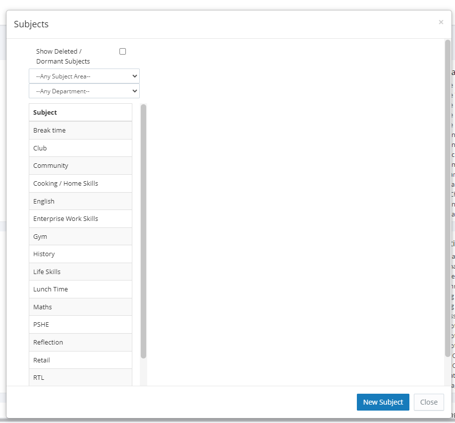 3. On the left, you will see a list of all subjects that have already been created. To create a new subject, click the blue New Subject button. To edit an existing subject, click on the Subject Name and proceed to Step 5.