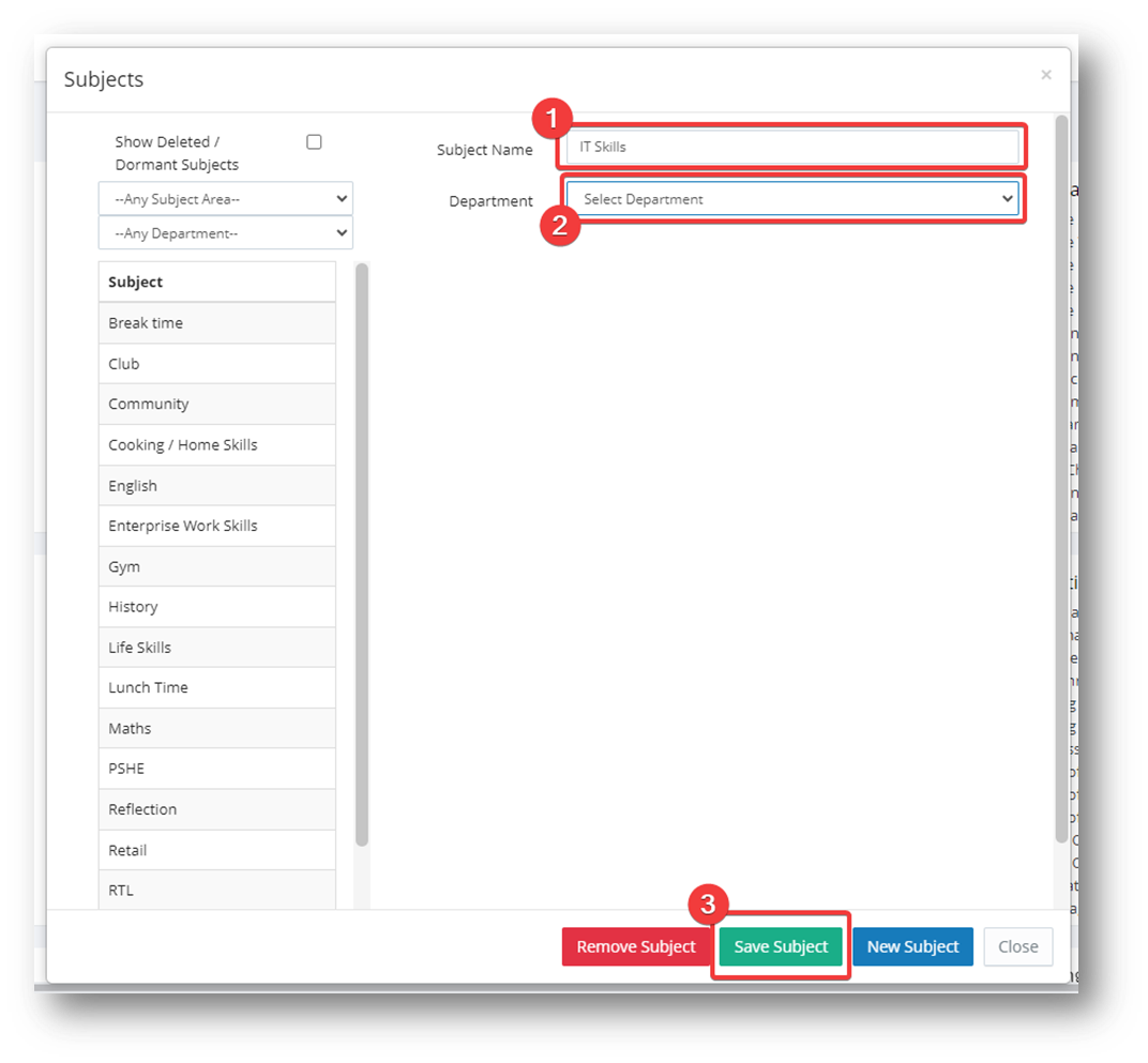 4. Type the name of the subject in the Subject Name textbox, and if relevant select a department that is related to the subject from the Department dropdown menu. Next, click Save Subject.