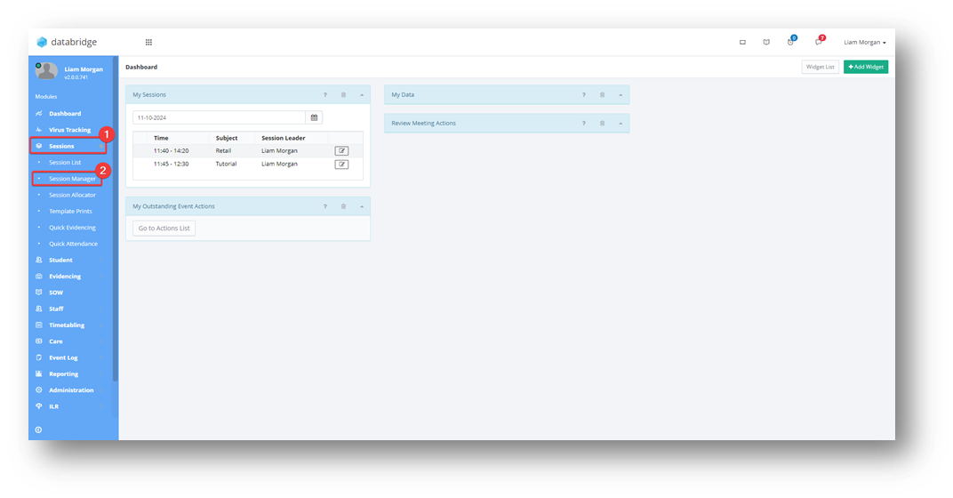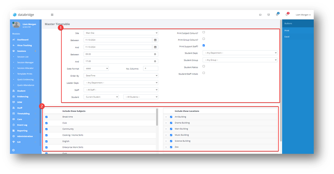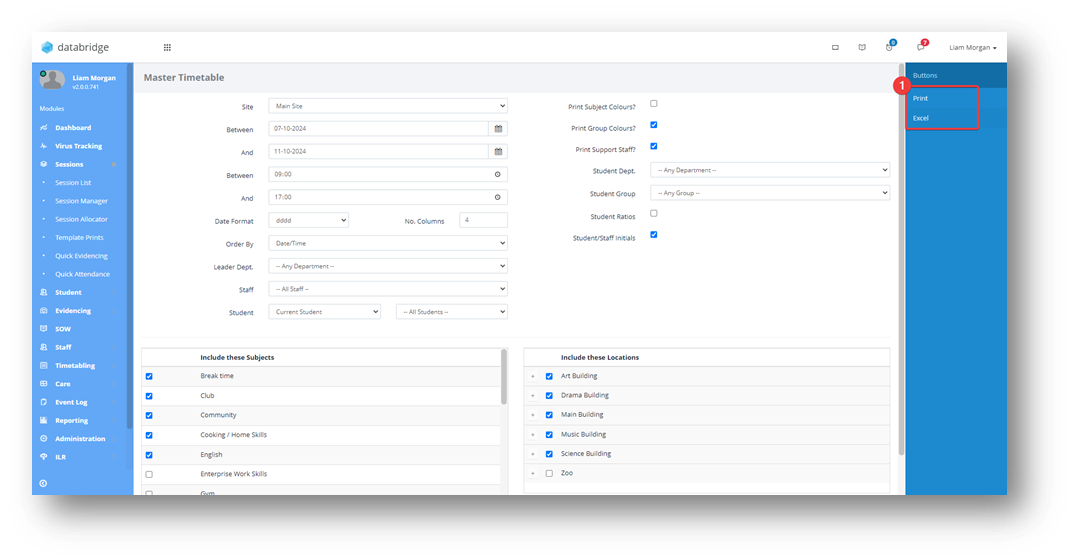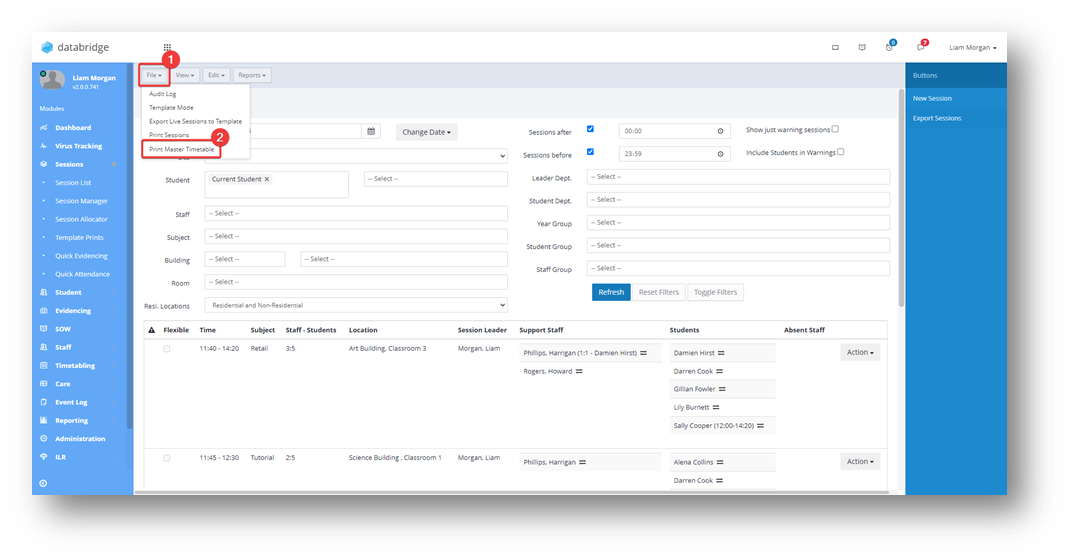 1. The Master Timetable looks at all sessions and is used to print custom timetables based on chosen filters. To access the Master Timetable navigate to Sessions > Session Manager.
