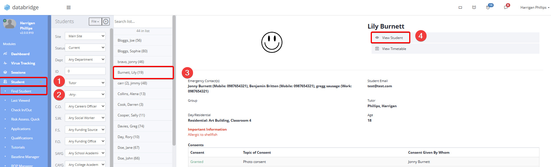 1.1 To view an Event Log on Databridge, you have two options. Firstly, if you wish to view an individual’s Event Logs, it can be done on their profile. To do so, navigate to Student > Find Student > Select the Student from the list > View Student.