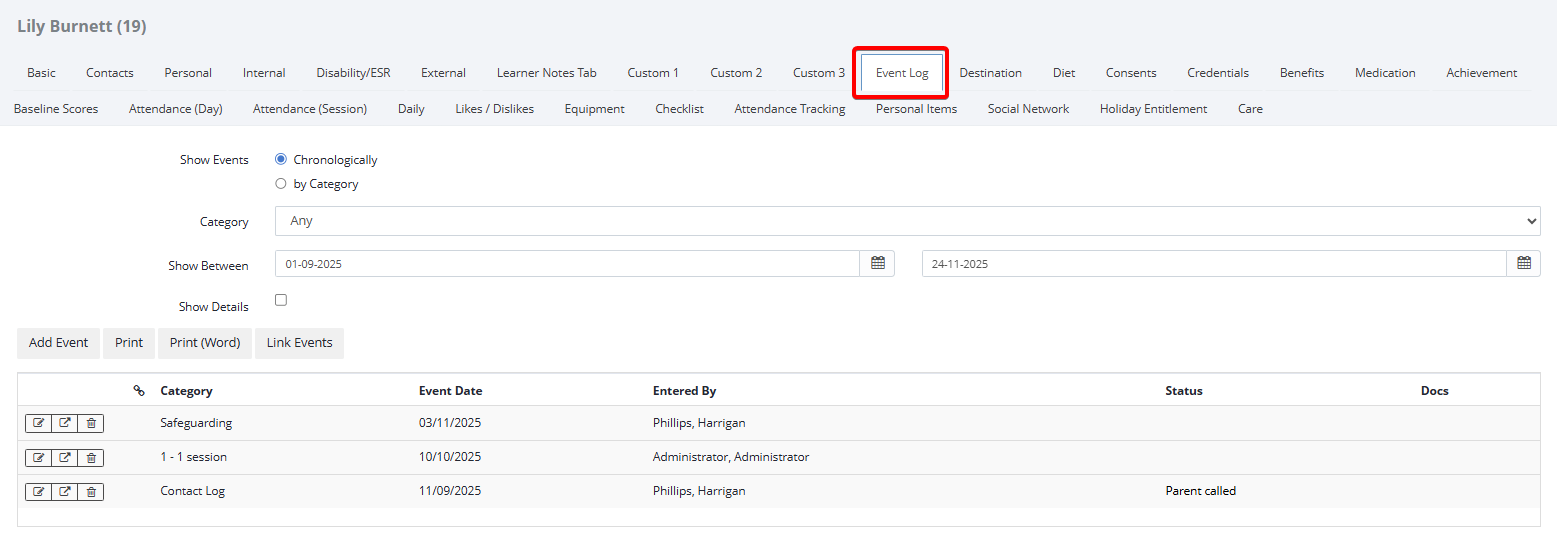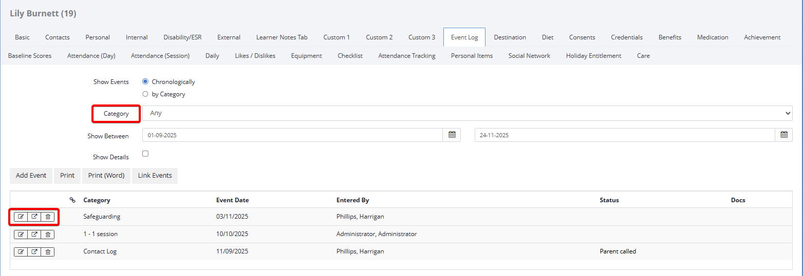 1.3 The Event Log Tab will show you all Event Logs attached to this student. At the top of the page, you have multiple filter options to narrow the list, such as Category, which will load all Events logged for this student under said category.