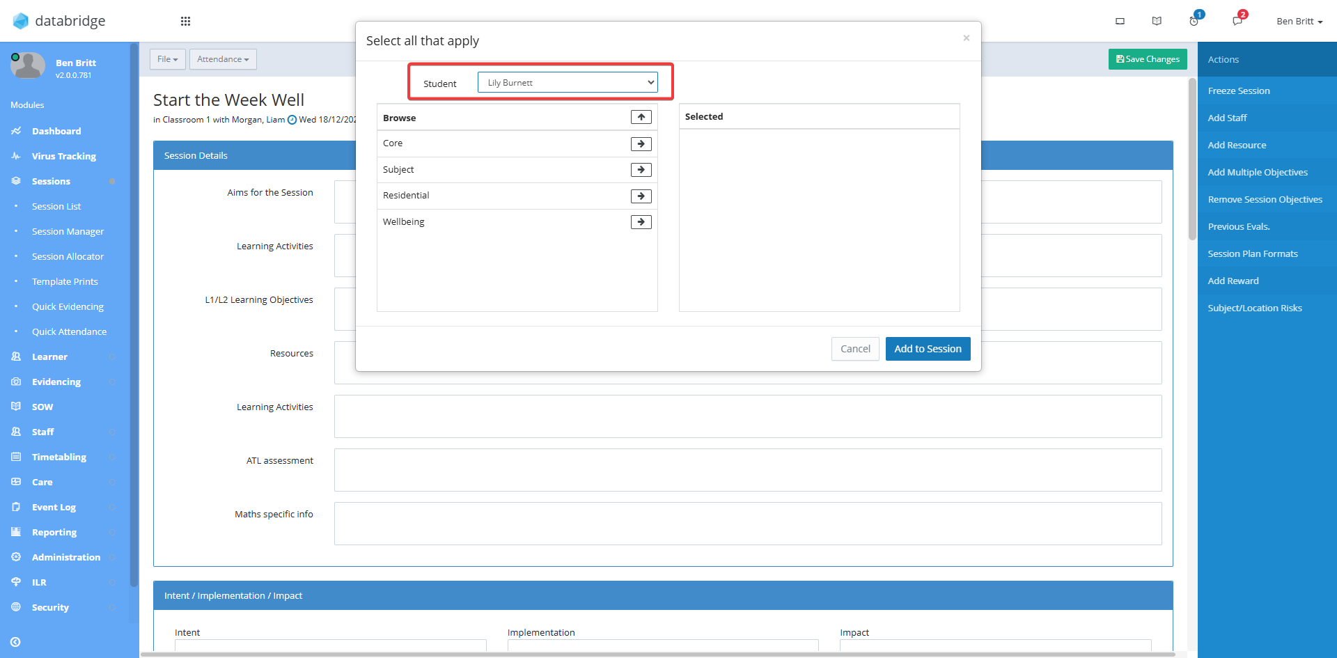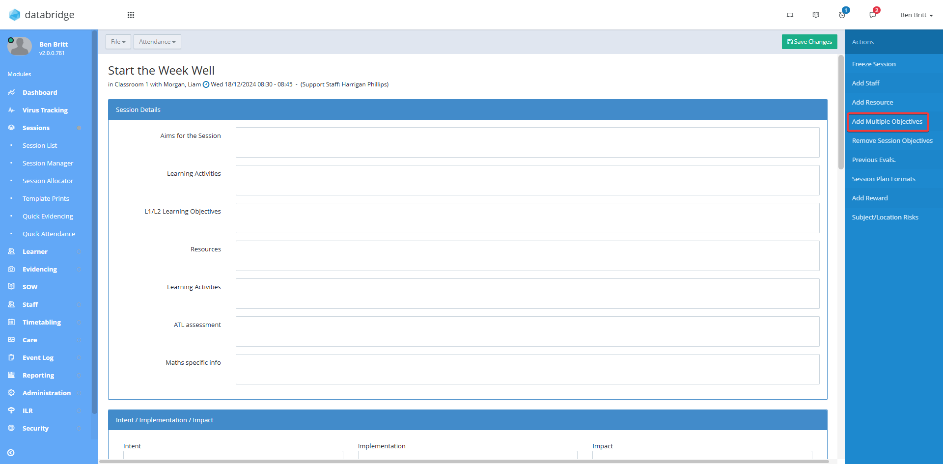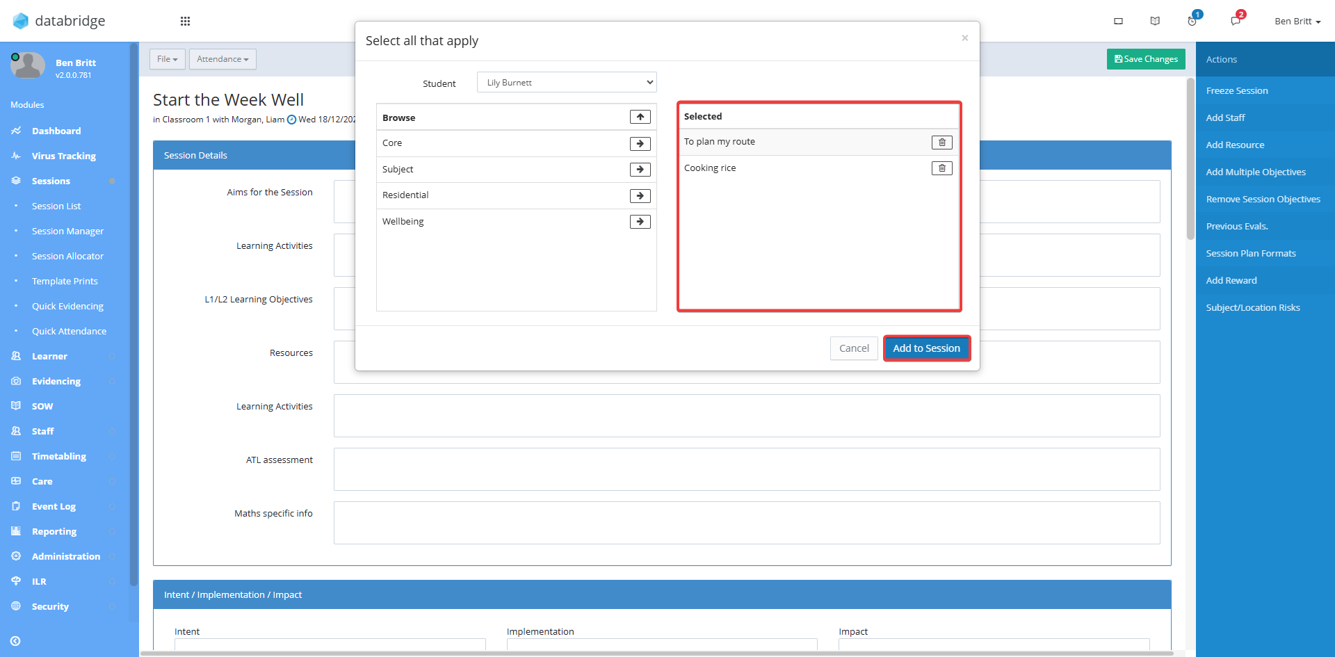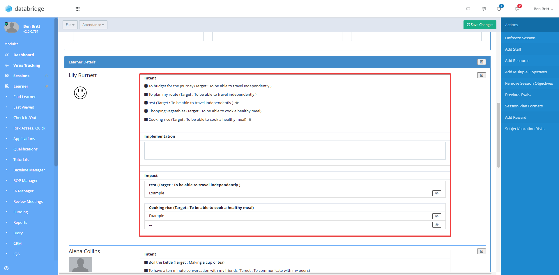 7. This appears in the students Learner Details section in their session plan with any other objectives already allocated to the session.