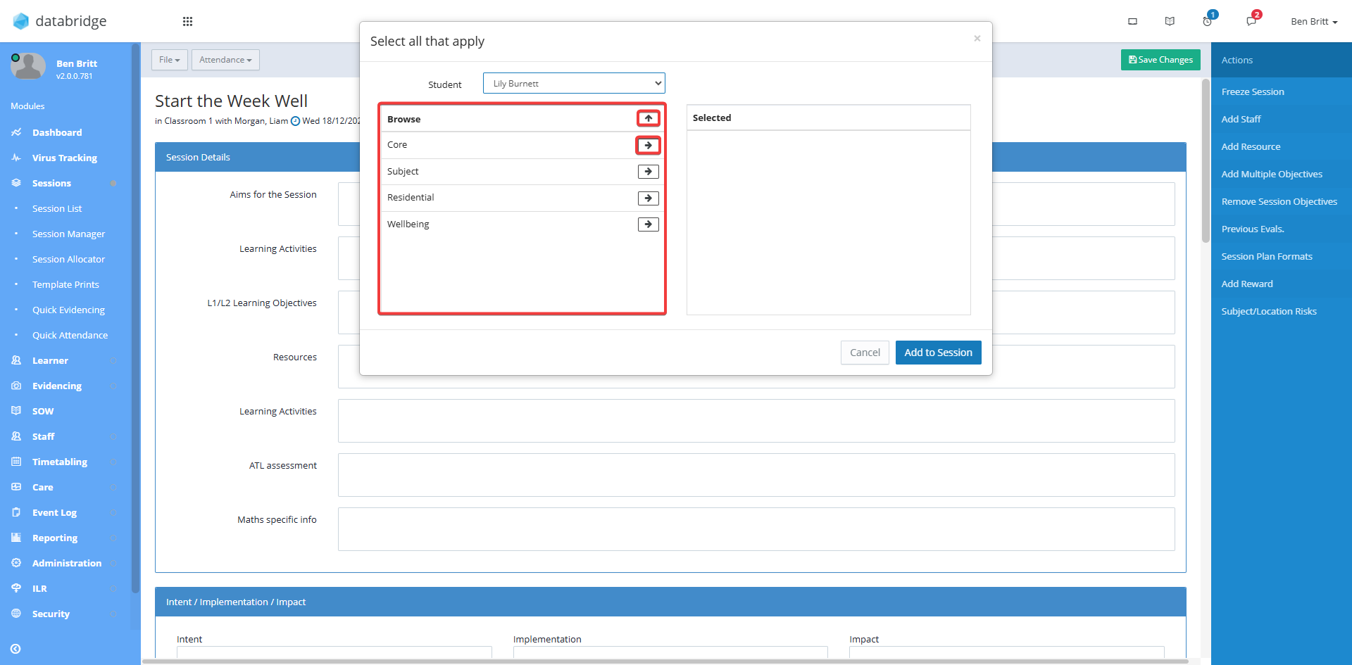 5. Using the Browse section, find the objective you want to set for this session from the students pre-set objectives.