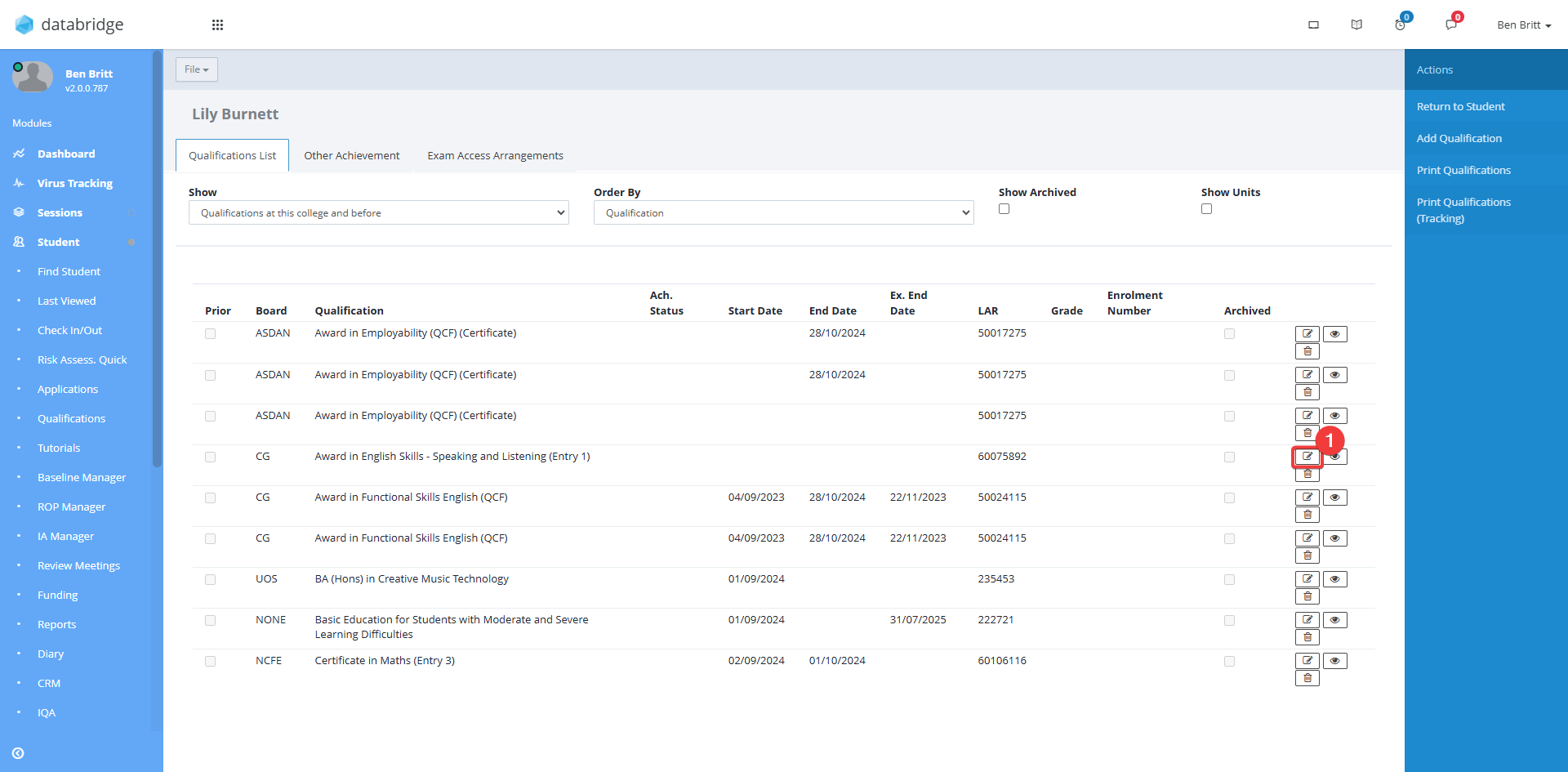 3. The Student Record Qualification page shows all completed and ongoing qualifications for this specific student.