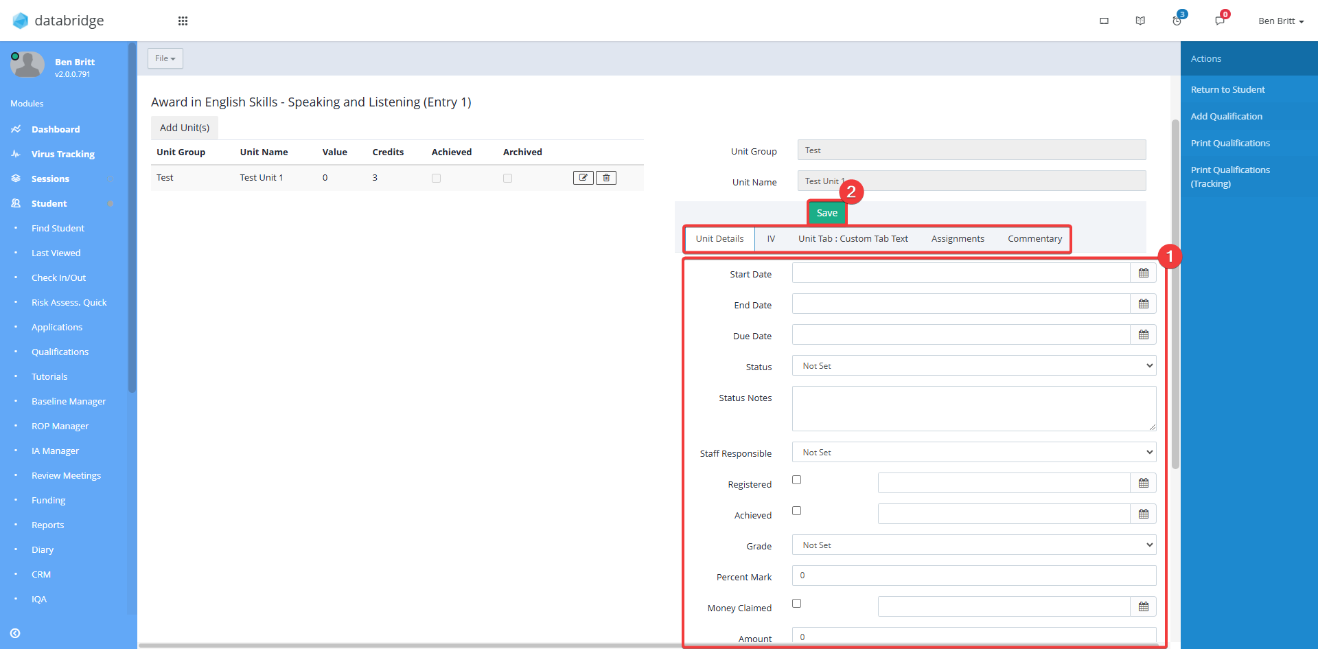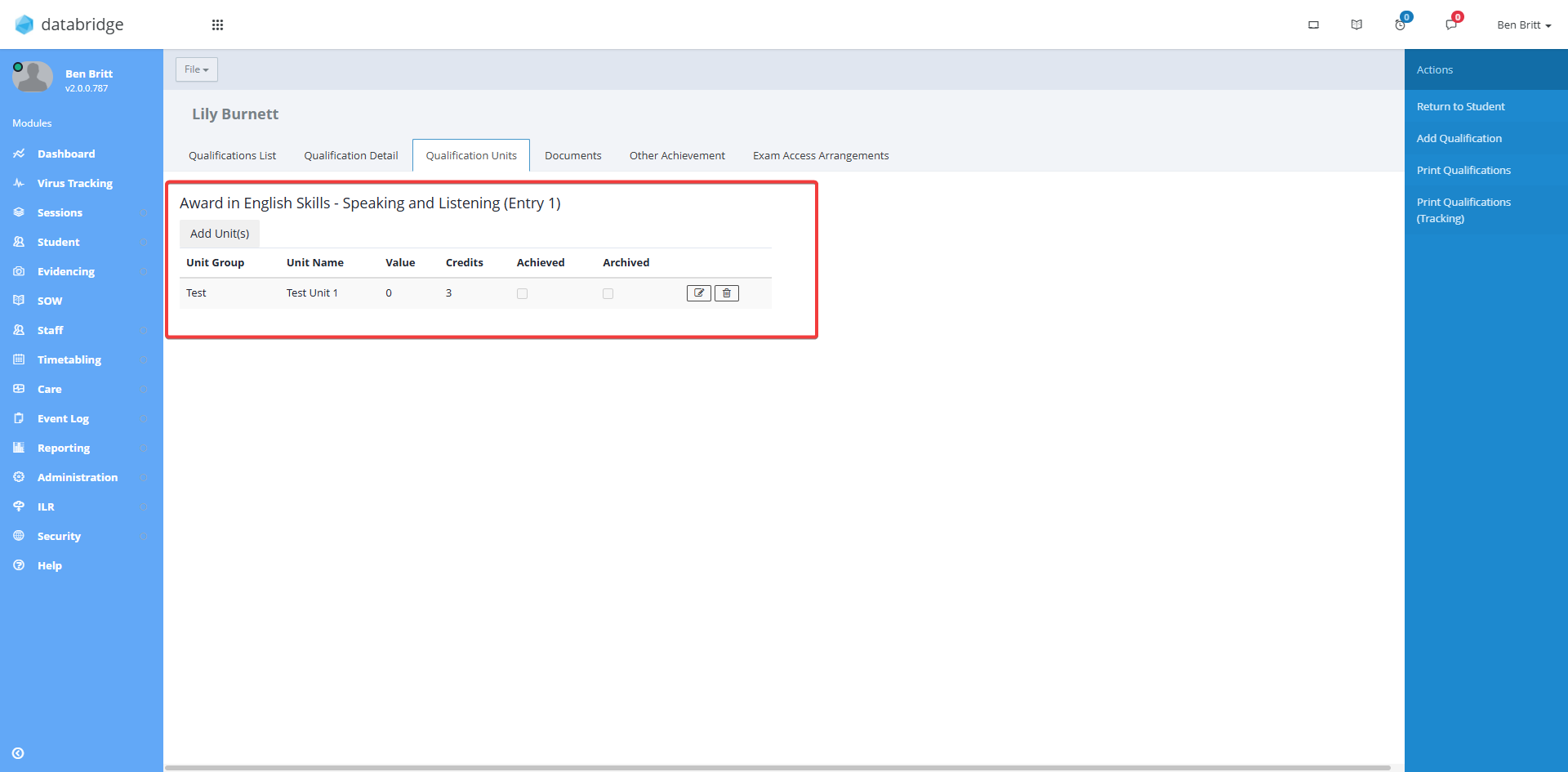 7. The Unit is now setup and will appear on the front page of the Qualification Units tab for that specific student.