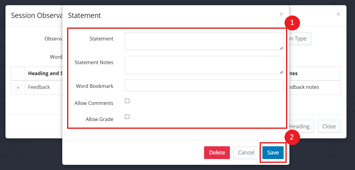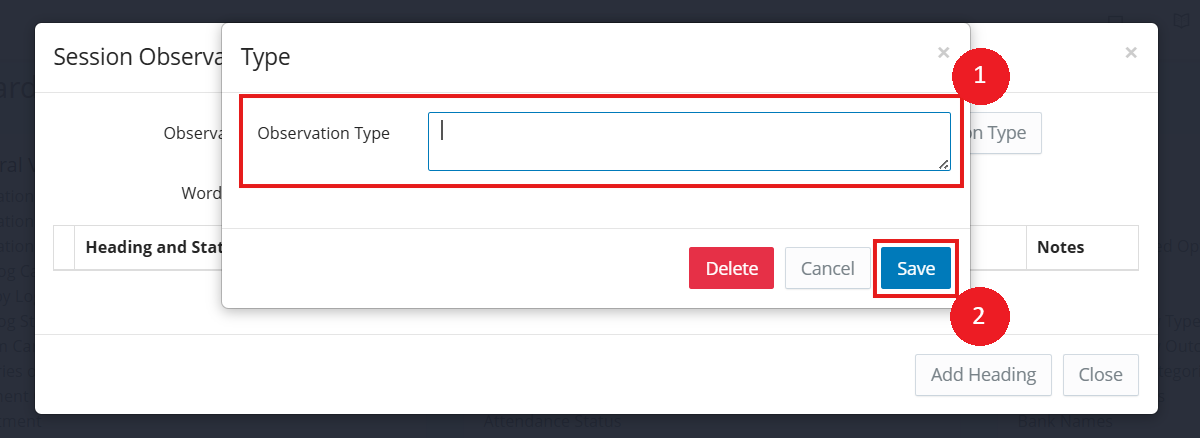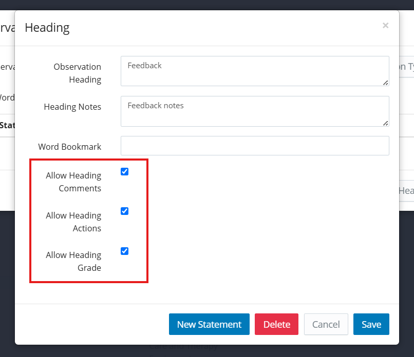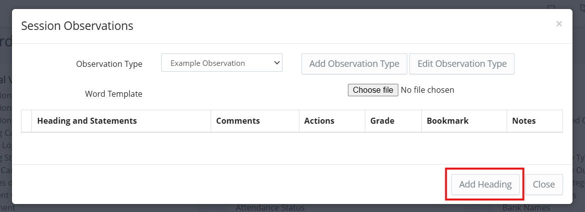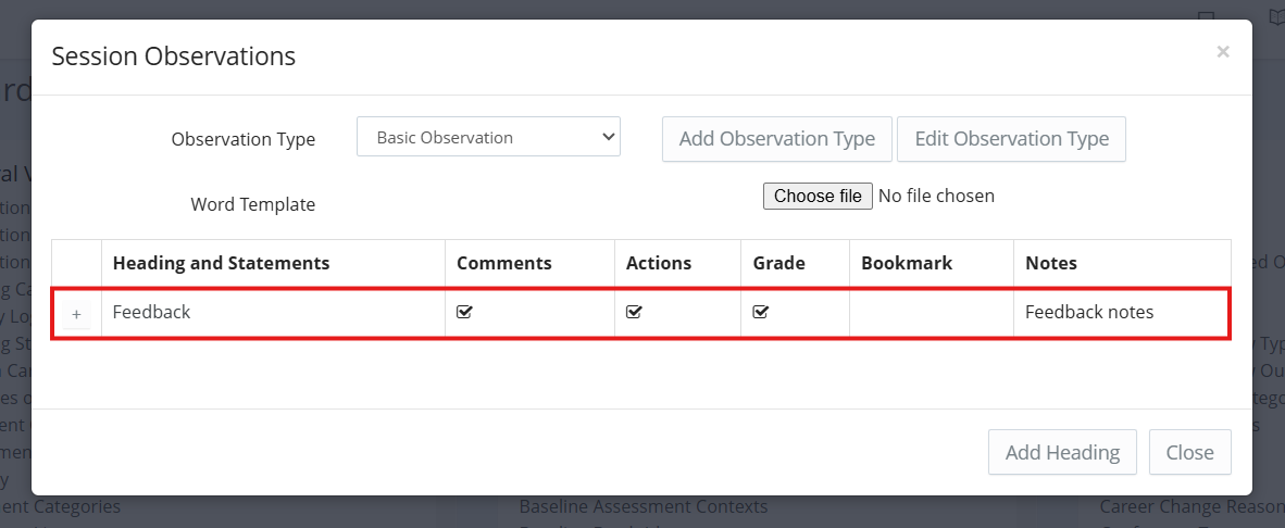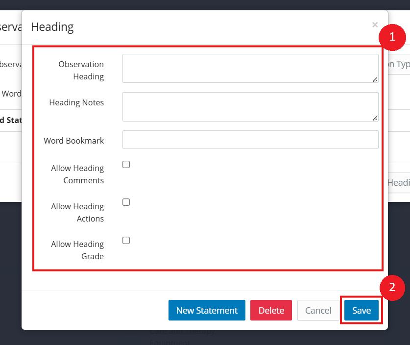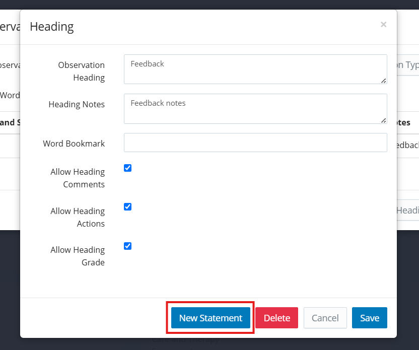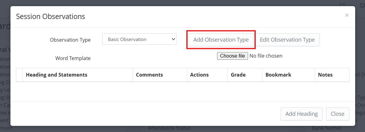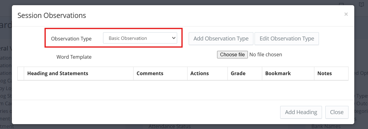 This will open a modal with a dropdown for Observation Type. Changing the option in here will change the list of headings and statements listed below.