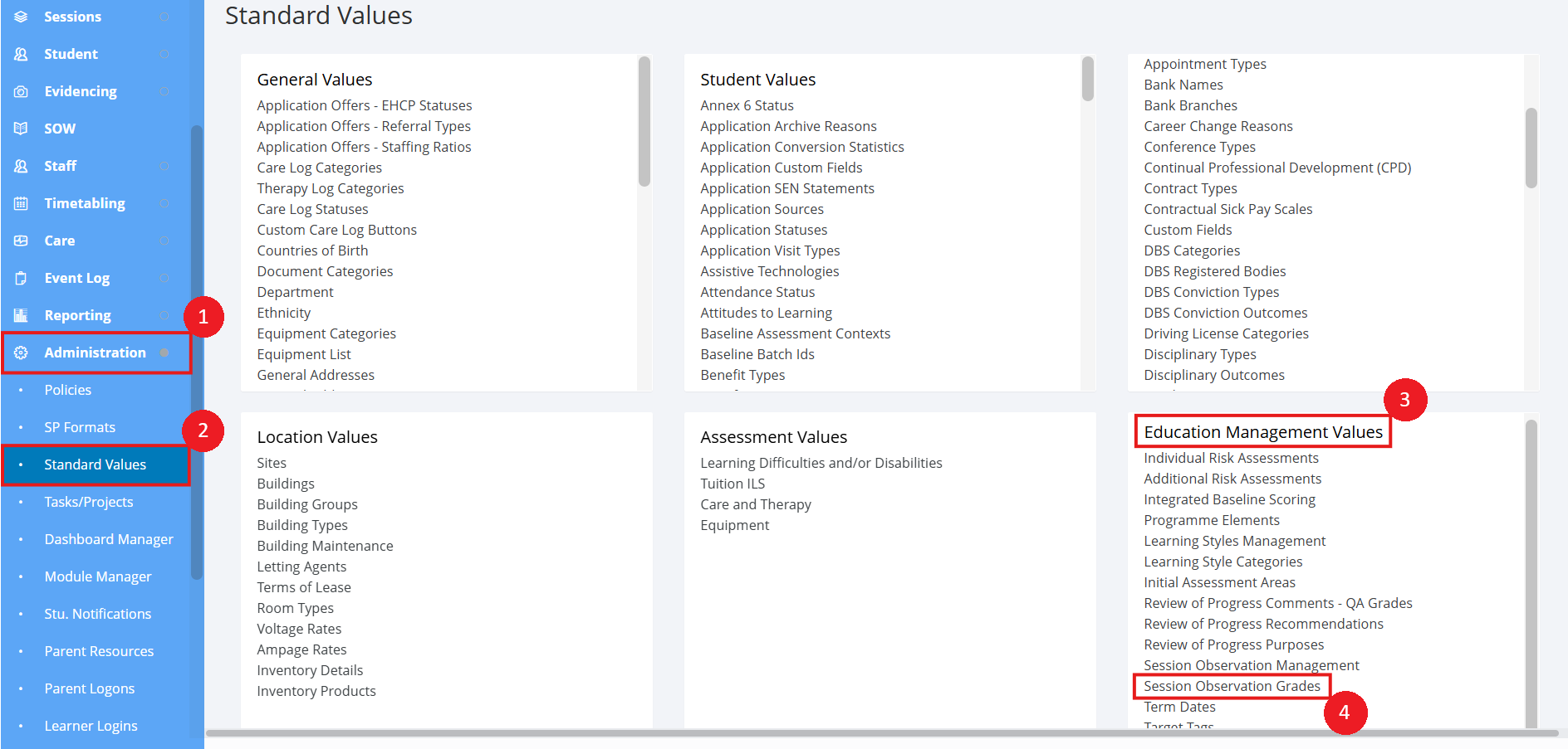 In the left hand navigation menu, select Administration > Standard Values. Under the Education Management Values area, select Session Observation Grades.