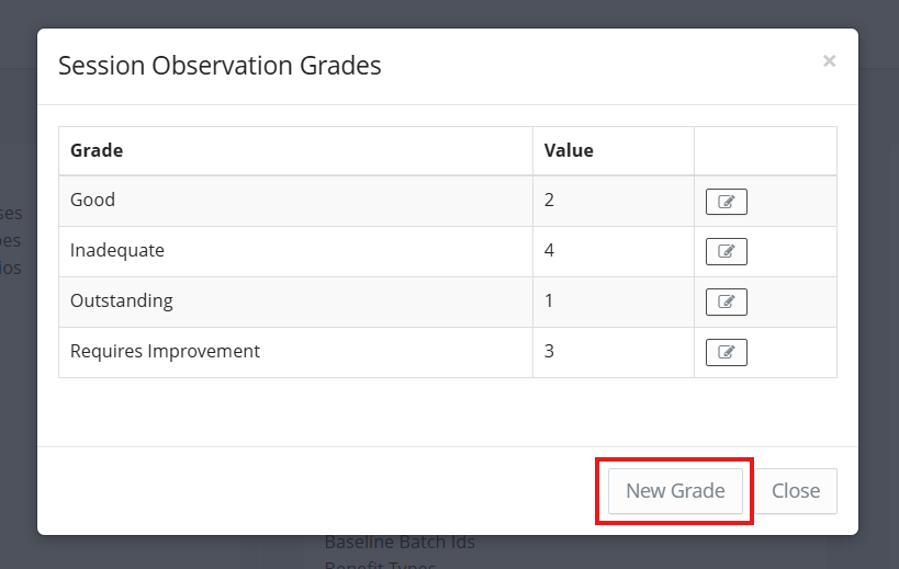 Create new grades by clicking on the New Grade option at the bottom of the modal. Give the grade a relevant title/label and appropriate numeric value e.g. Outstanding - 1.