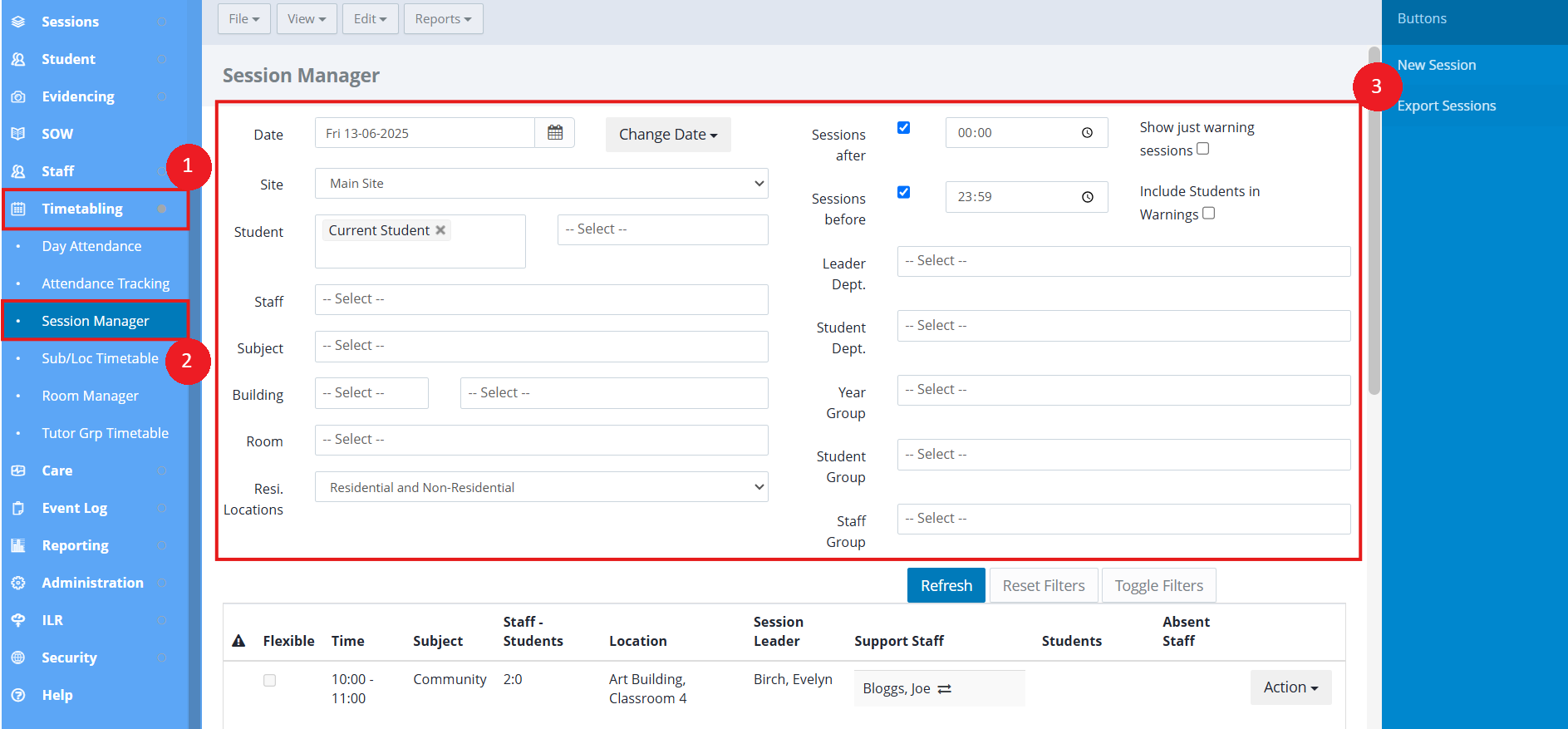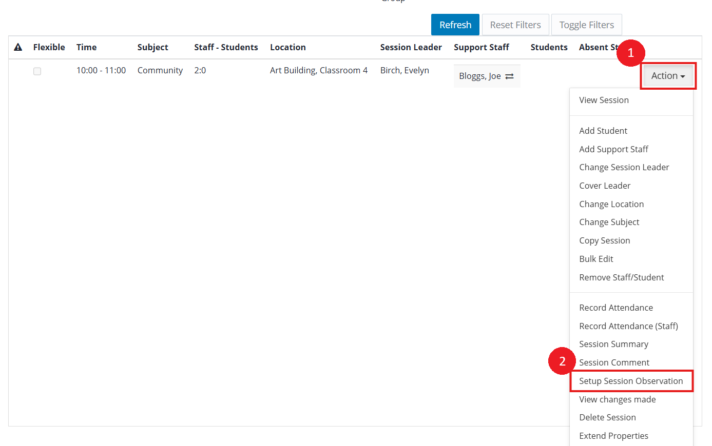 All Observations are created via the Timetabling > Session Manager screen. Using the filters available, locate the individual Session you wish to create an Observation for.