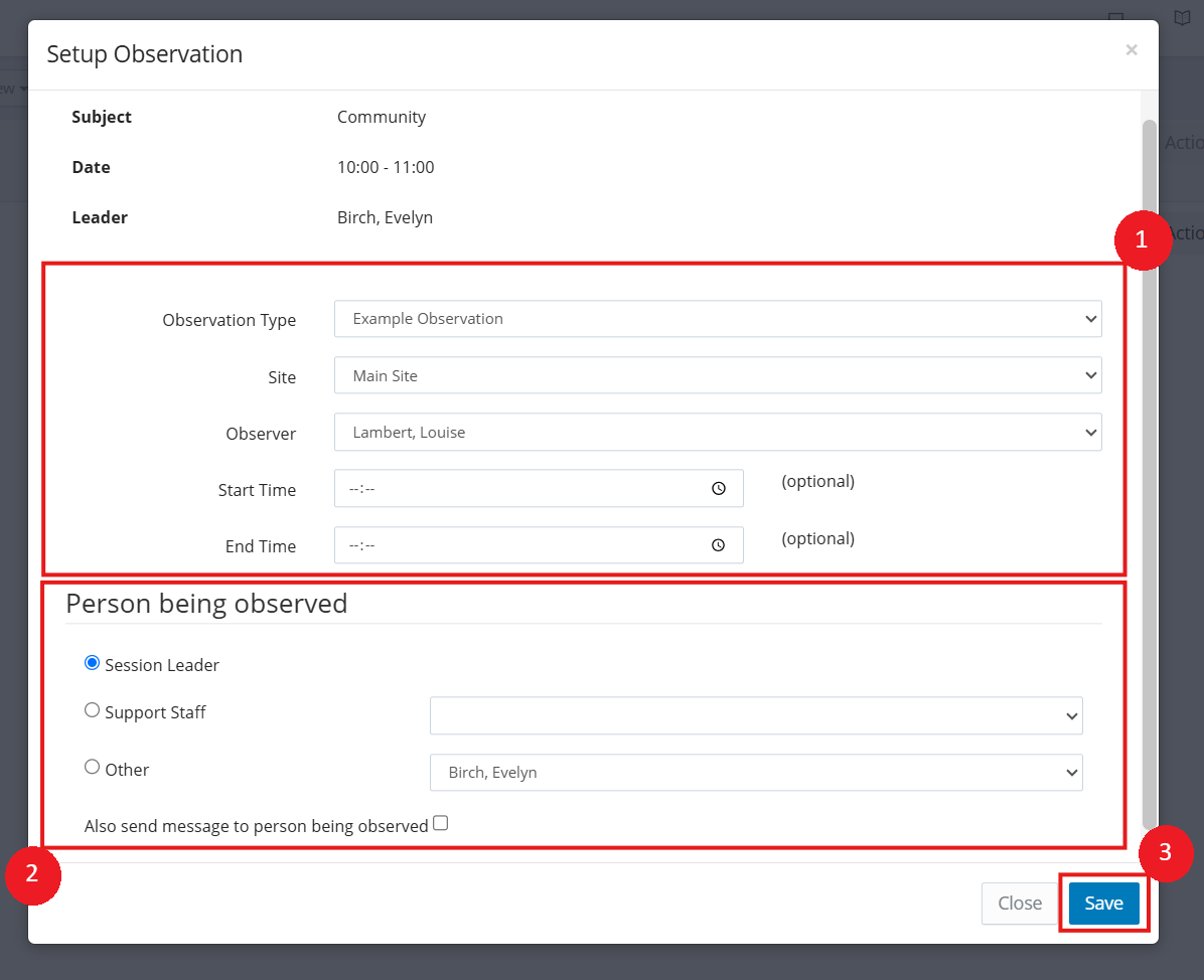 A modal will appear asking you to select the relevant Observation Type, Site, Observer, Start/End Time (if different to Session Time) and the Person Being Observed. Enter the relevant details and click Save.