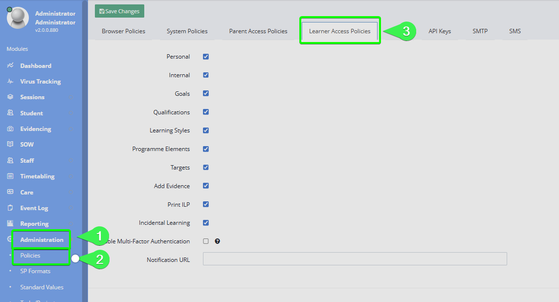 1. To set the modules you want to appear, click on Administration > Policies > Learner Access Policies