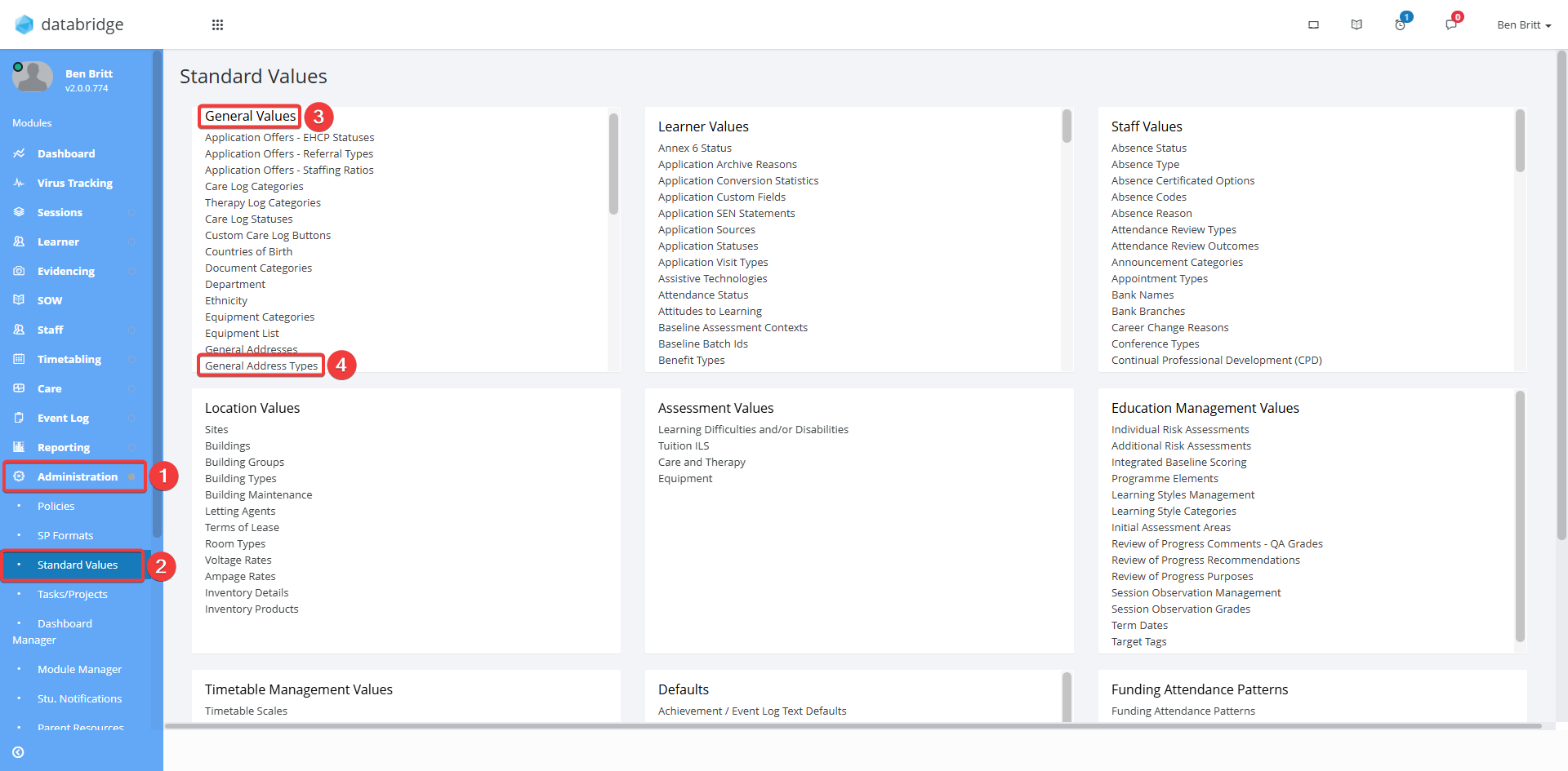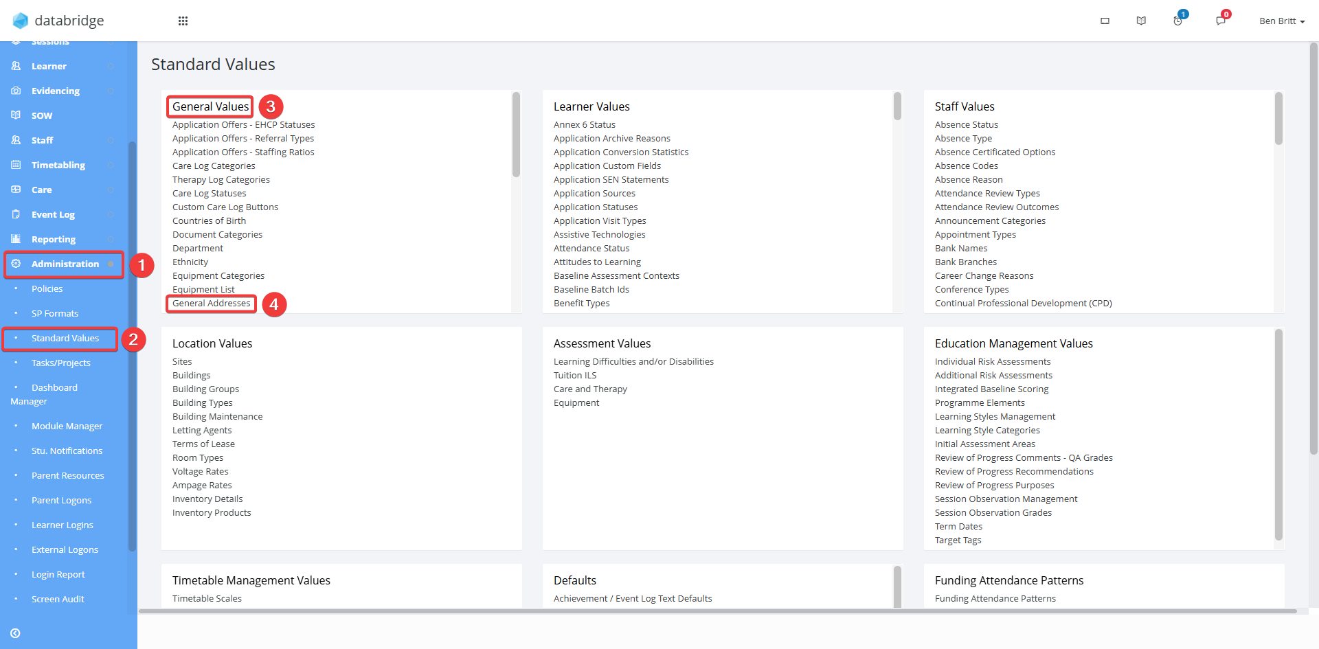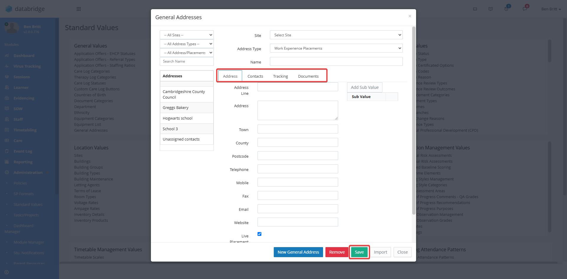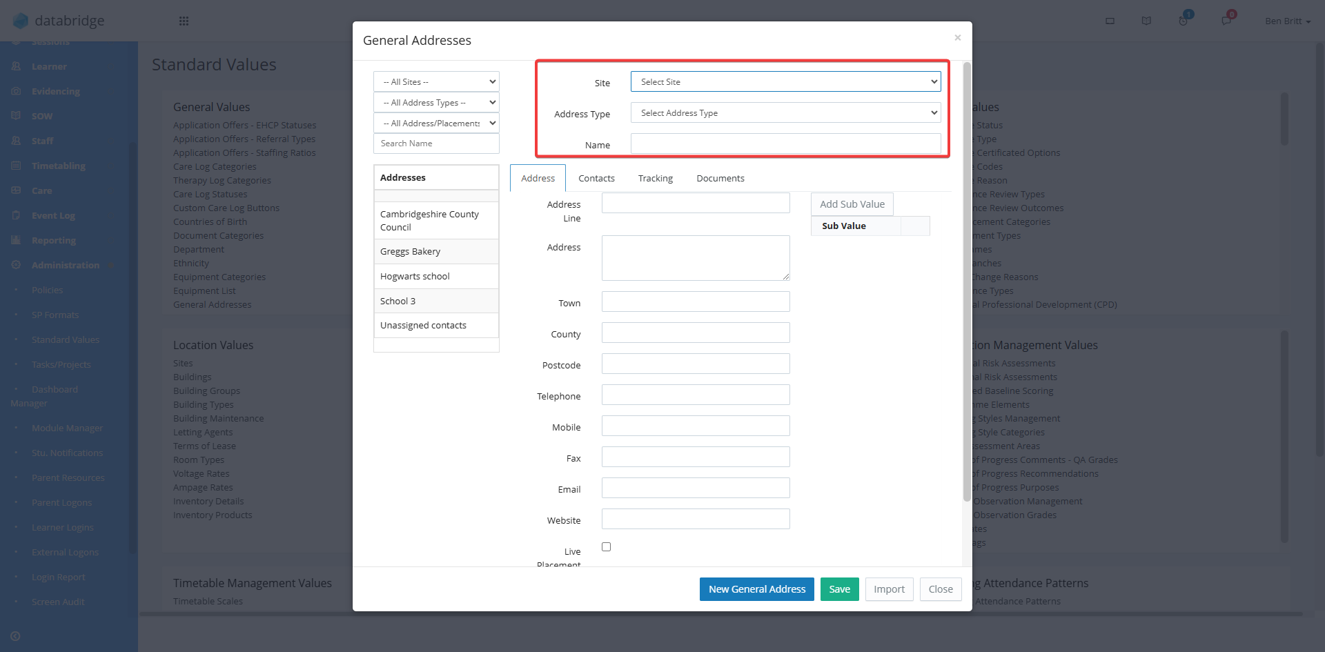 In this guide you will be shown how to setup General Addresses, and add them to a Student' profile. General Addresses are for any contacts that can be applied to more than one Student. For example, you may wish to record details about local doctor's surgeries, local schools/colleges and local companies for work experience.