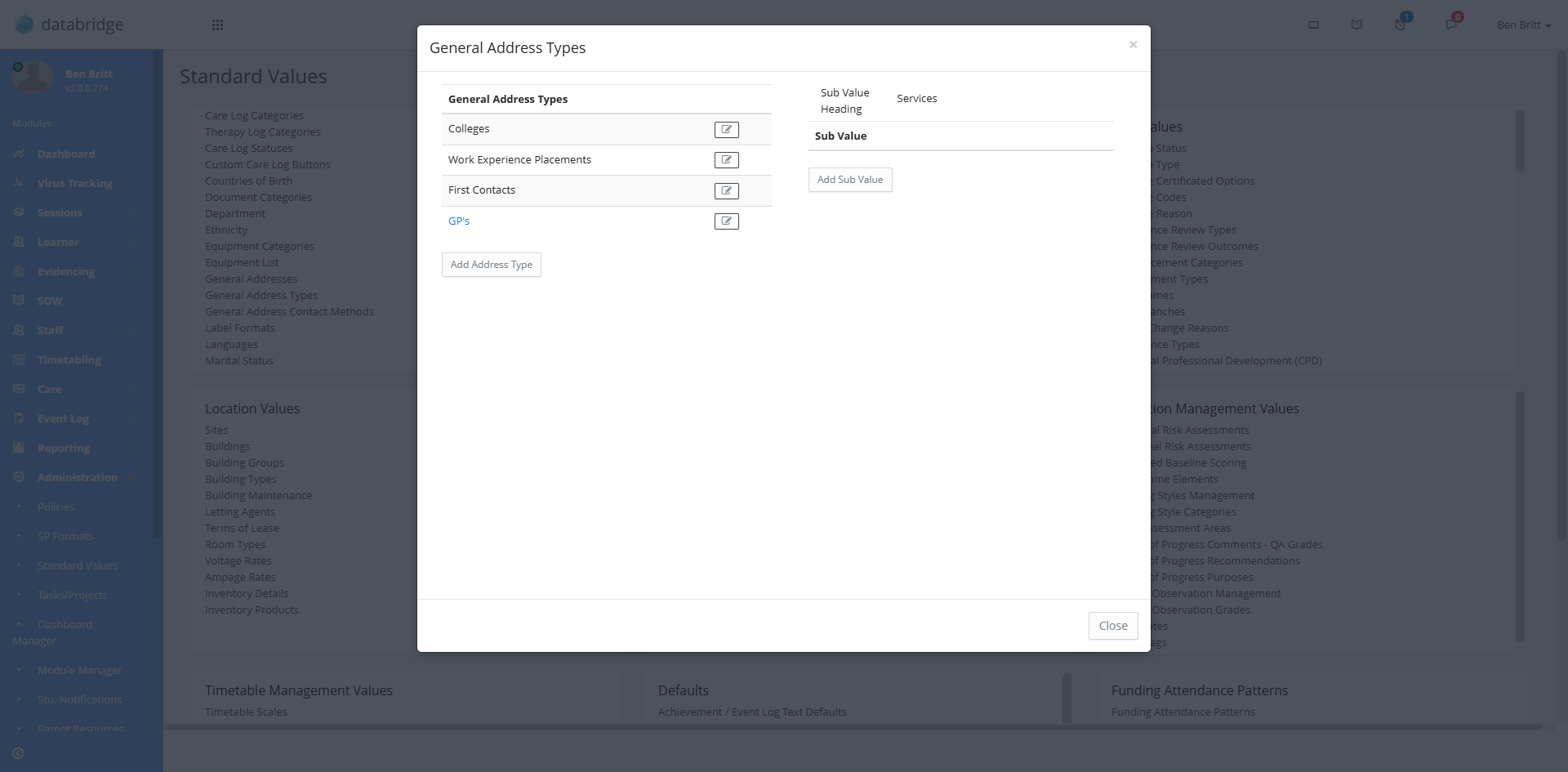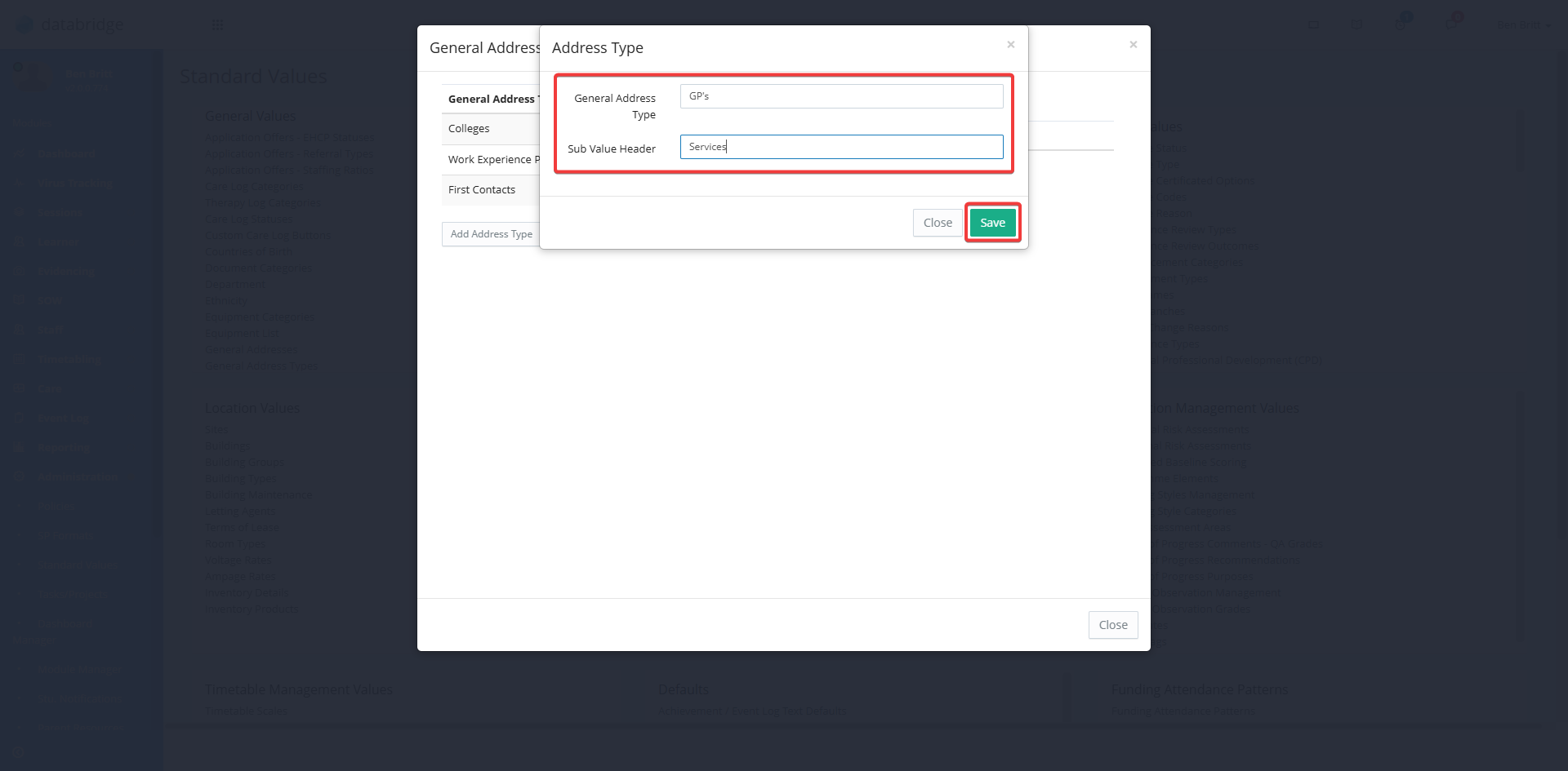 3. Enter a name for the General Address Type. If required you can also add the Sub Value Header. For example, for GP you could set this as 'Services' such as a Pharmacy or Therapy to indicate that the sub values are going to be the various services the practice offers. Click Save when the fields are complete.